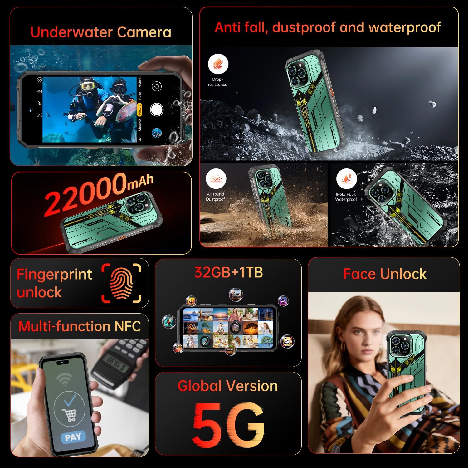 16PROMA X 32+1TB Rugged Armor Unlocked Cell Phone,Smartphone 6.99″ HD Screen Android 15 Battery 22000mAh AI Unlocked Phone,Face ID/Fingerprint Unlock/Underwater-night-Photo/Dual SIM/5G/NFC (Green)