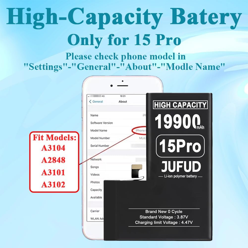【Strong power】JUFUD replacement battery used for iPhone 15 Pro, top lithium polymer cell, 19900mAh large capacity, 0 cycles of new electricity, durable to 1800 cycles, strong battery life, goodbye to power anxiety.