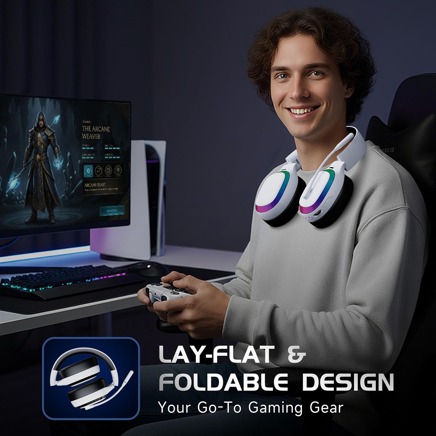 【Portable, Durable & RGB-Ready】A foldable, lay-flat structure makes this ps5 headset wireless easy to pack and carry wherever you game. Dynamic RGB lighting adds a modern look while enhancing your setup. Stylish yet practical, this wireless gaming headset is ready for both home battlestations and travel