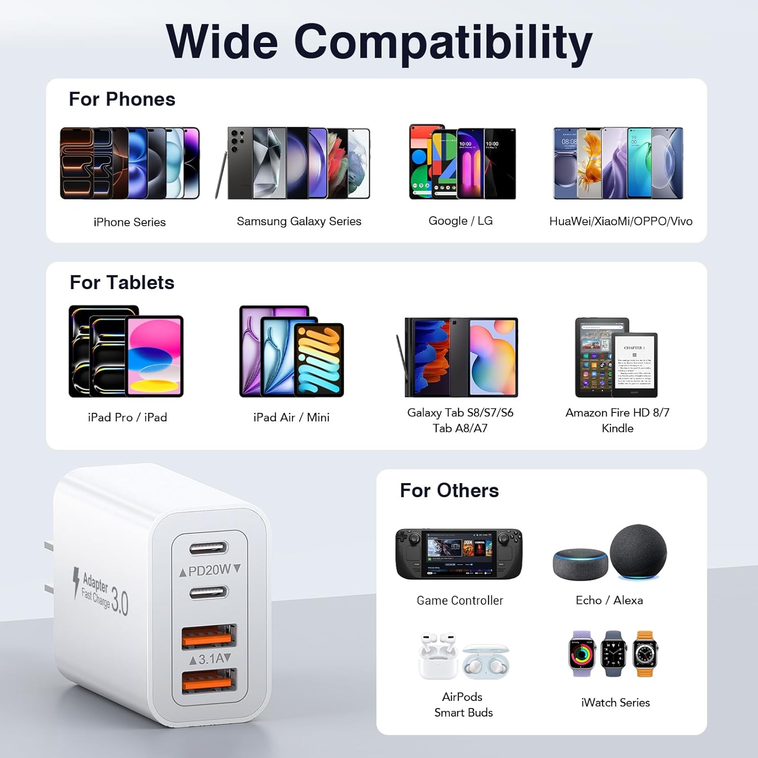 Universal Compatibility Wall Plug:The USB C Charger plug due to the special 4-port,the USB charger is compatible with almost all electronic devices,charging adapter for iPhone 17/17 Pro/17 Pro Max/17 Air/16/16 Pro/16 Pro Max/16 Plus/15/15 Pro /15 Pro Max/14/14 Pro/14 Pro Max/13/13 Mini/13 Pro Max/12/12 Pro Max/12 Pro Max/12 Mini/SE 2020/11/11 Pro/11 Pro Max/XR/XS/X/8/7,iPad Air/Pro/Mini,Samsung Galaxy S22/S21/S20/S10/S9/S8/A12/A13/A22/A32/A52/A53/A71/Note 20 10,Tablets,LG,Motorola,Google Pixel and other digital devices compatible