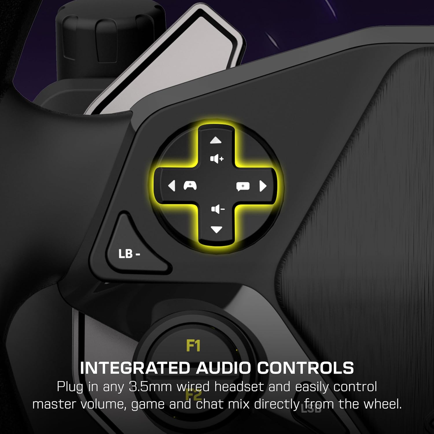 Plug in any 3.5mm connected headset for immersive gaming audio on Xbox or PC and easily control master volume plus game and chat mix directly from the D-pad on the wheel.