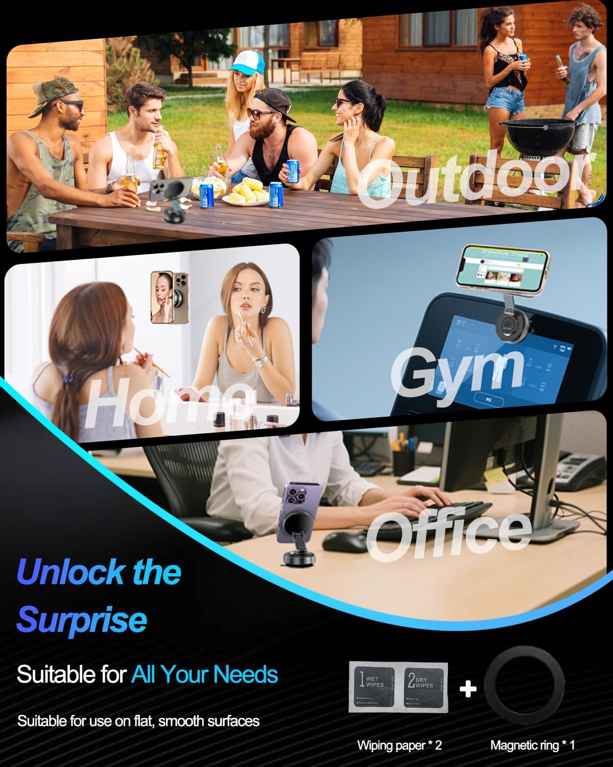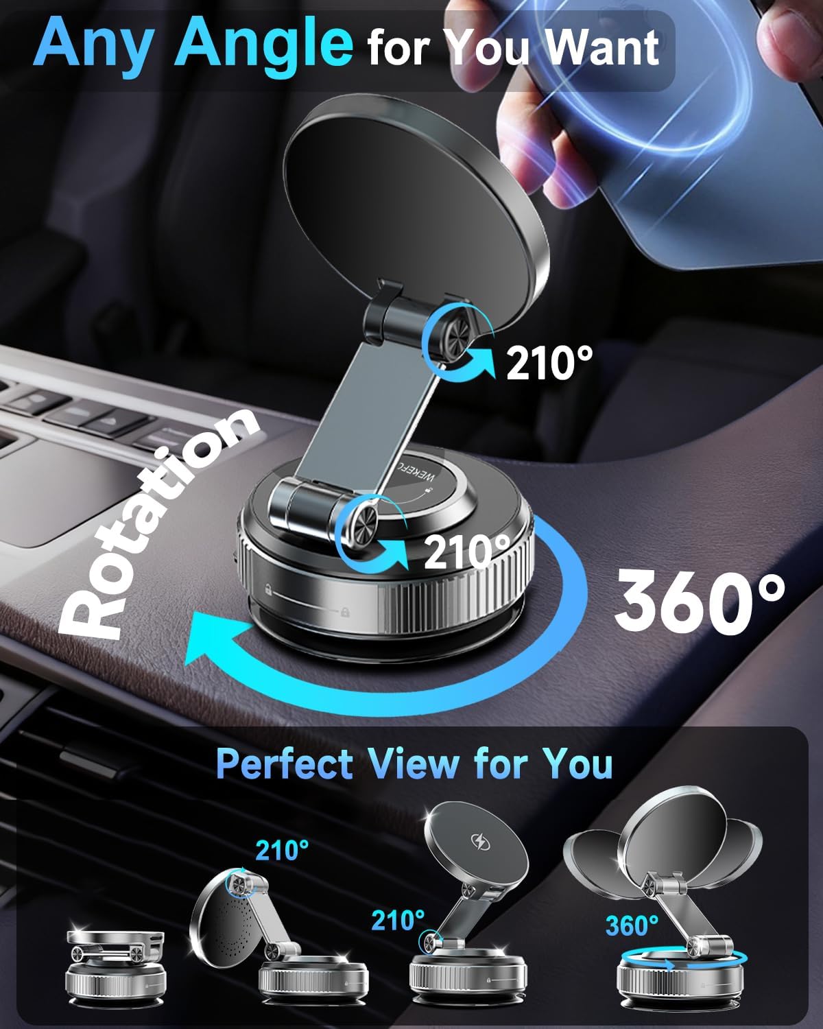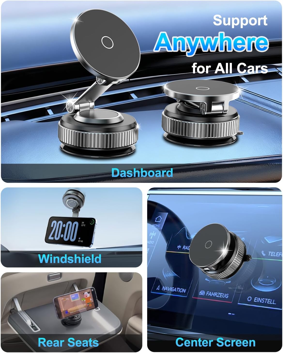 【Versatile Usage Scenarios】Upgraded vacuum suction cup magnetic phone holder can firmly adhere to surfaces such as car dashboards, windshields, mirrors, and marble. Its strong magnetism protects your phone 100% from falling off. It can be used in various scenarios such as driving, exercise, or daily life, adjusting the angle of the phone holder as needed. It is compact, foldable, and easy to carry, making it an ideal choice for use in the car or at home.
