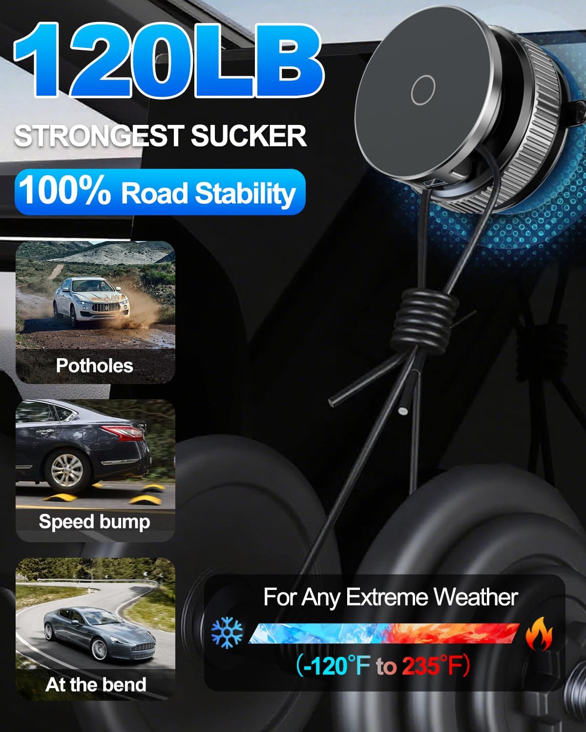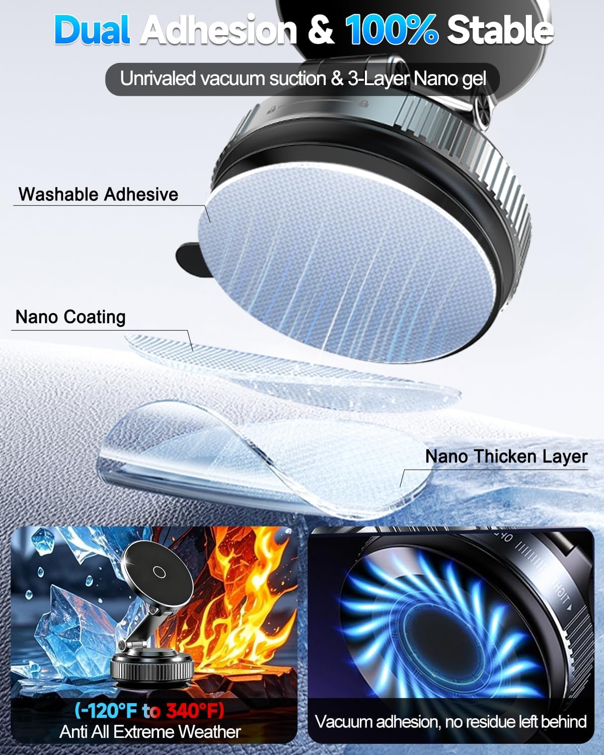 【100% Stable & Strong Suction】This upgraded vacuum suction cup car phone holder has increased stability by 48% compared to traditional holders. It can also maintain the stability of the bracket on bumpy roads or when suddenly stopping. The 3-layer high-strength nano gel suction cups can support up to 120 pounds of weight and remain firm in extreme temperatures (-45 ° F to 330 ° F). After 10000+durability tests and 1000+reattachments, it can be washed with water and restore 99% of its suction power, possessing long-lasting stability.
