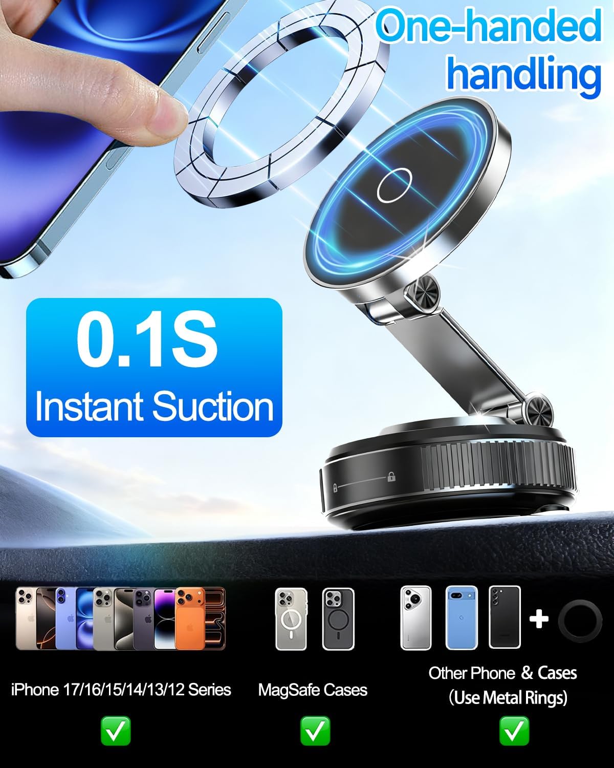 【Compatibility & Easy Installation】This magnetic phone holder for car is designed for iPhone 17/16/15/14/13/12 series and for all MagSafe devices. In addition, it includes a magnetic ring that provides the same strong magnetic fixation for non MagSafe phones. Whether your phone is naked or placed in a phone case, it can be easily operated with one hand and magnetically attracted within a second. Its excellent compatibility is suitable for various vehicle models, ensuring safe and easy installation in any vehicle. One handed installation is both fast and easy!