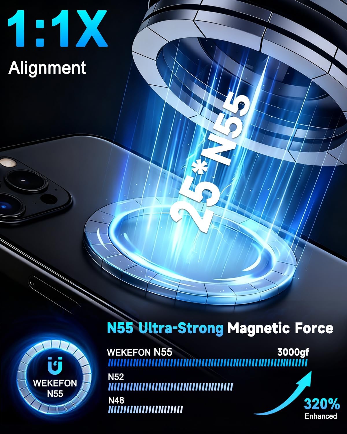 【2026 Upgrade Ultra-Strong Magnetic Phone Holder】Strong magnetic phone holder is equipped with 25 high-performance N55 magnets, which have a magnetic force 320% stronger than standard magnets and can provide up to 3000 gf of magnetic force. One handed placement, automatically aligning with the built-in magnet of the phone, 1 to 1 Alignment. After 7000 extreme road simulations, your phone remains safe and won’t fall off during bumps, sudden stops, or sharp turns. The precise magnetic design will not interfere with the phone signal, it is your perfect choice.