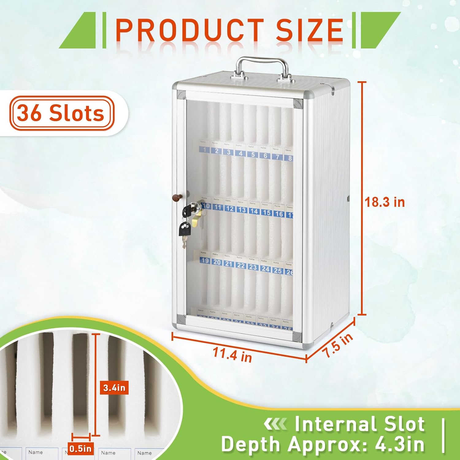 PREMIUM MATERIAL: The classroom cell phone holder is made of aluminum alloy, MDF and transparent plexiglas, featuring sturdy, enduring, waterproof and anti-pressure. There are two keys in total to the safe for double security.
