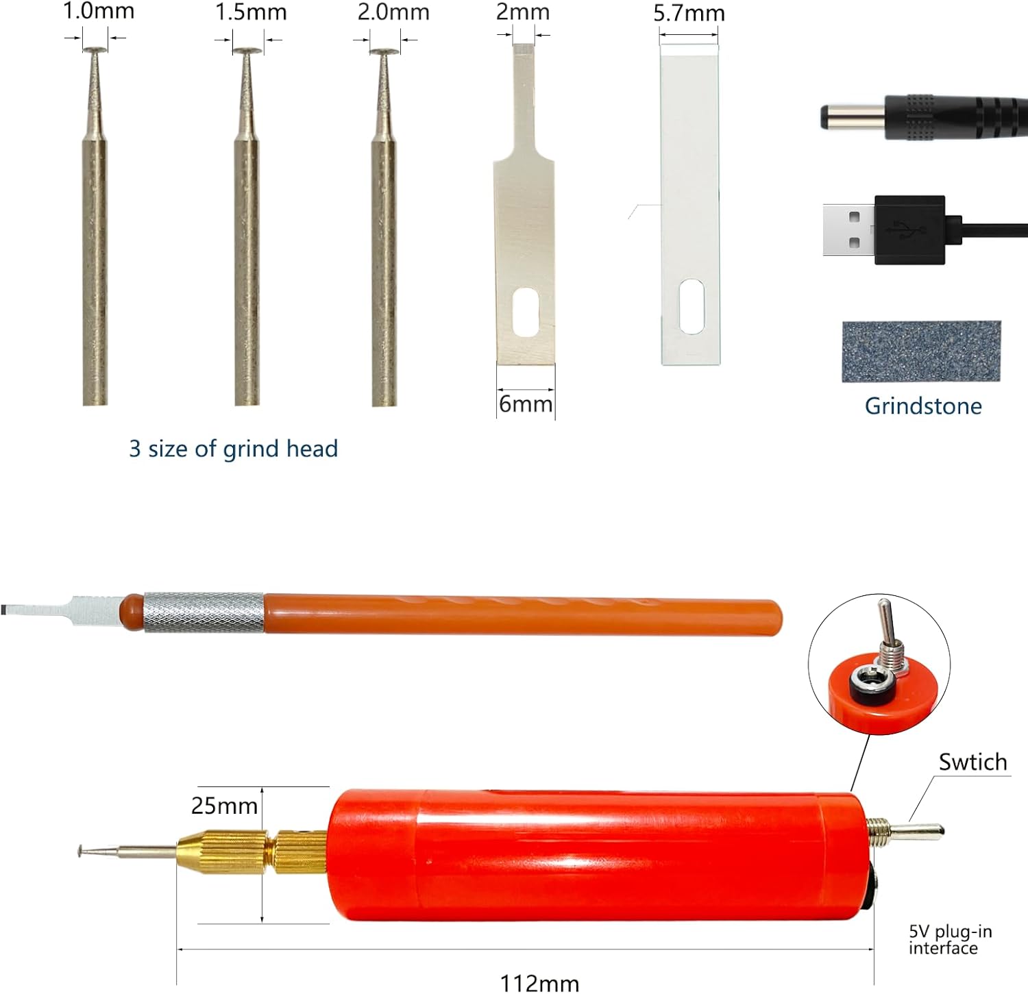 【Easy to use】Install the cutting head, here please note that insert the hex screwdriver into the hex screw at the bottom of the chuck, then tighten the nut. Then cut a groove like “1”, ensuring that the groove is deep enough to grip the blade, which will increase the probability of success. Insert the USB power supply, USB 5V,As the power of the grinder is 10W, in order to ensure that the grinder can work properly, it is recommended that you use an adapter of 10W or above .