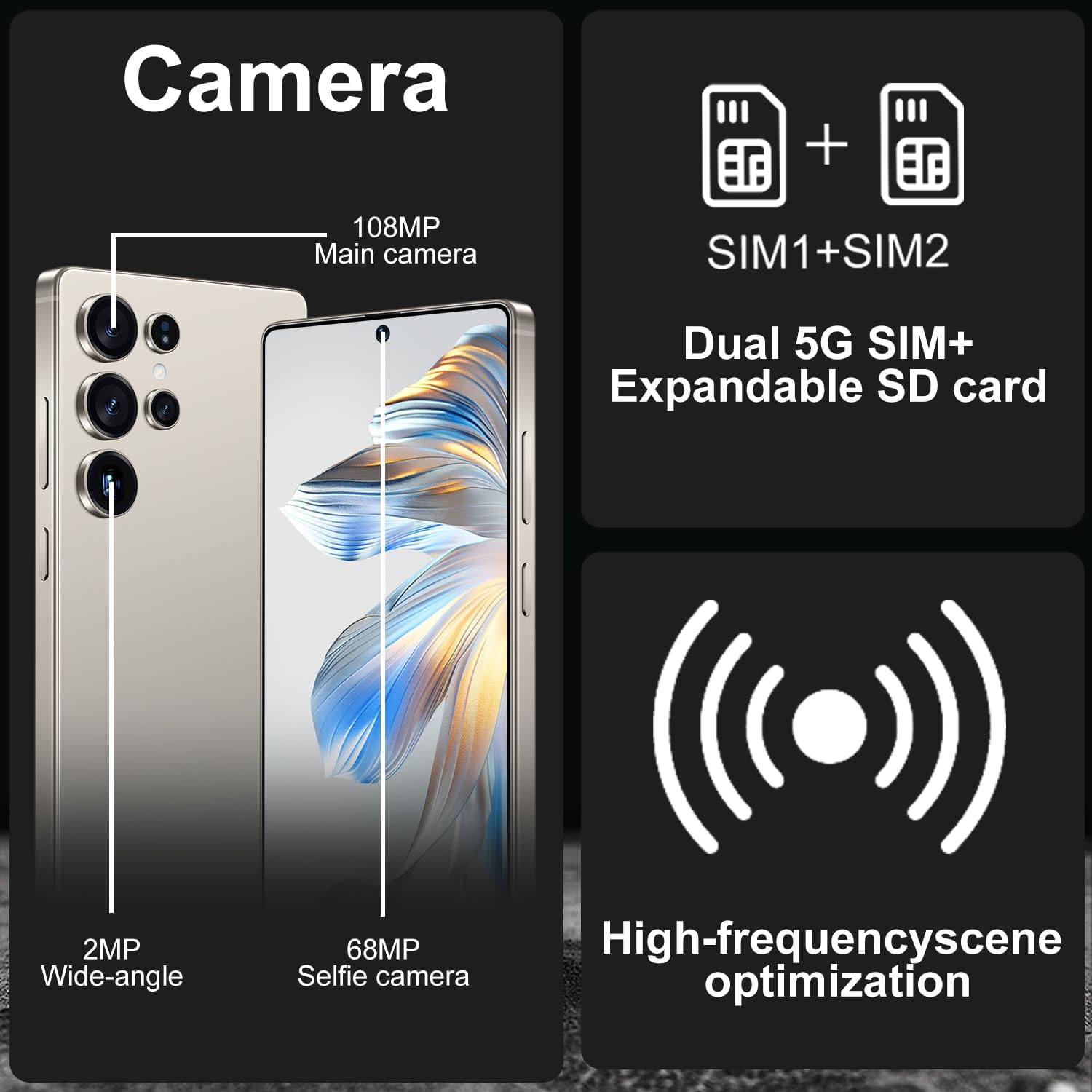 Fourth bullet point: Camera. 68MP +108MP, photo quality, scenarios like landscapes, portraits, low-light. “Capture every moment in stunning detail with the 68MP +108MP camera setup.Take professional-quality photos, from vibrant landscapes to sharp portraits,The advanced camera system adapts to various lighting conditions, ensuring clear, detailed shots even in low light.Perfect for photography enthusiasts and casual users alike.