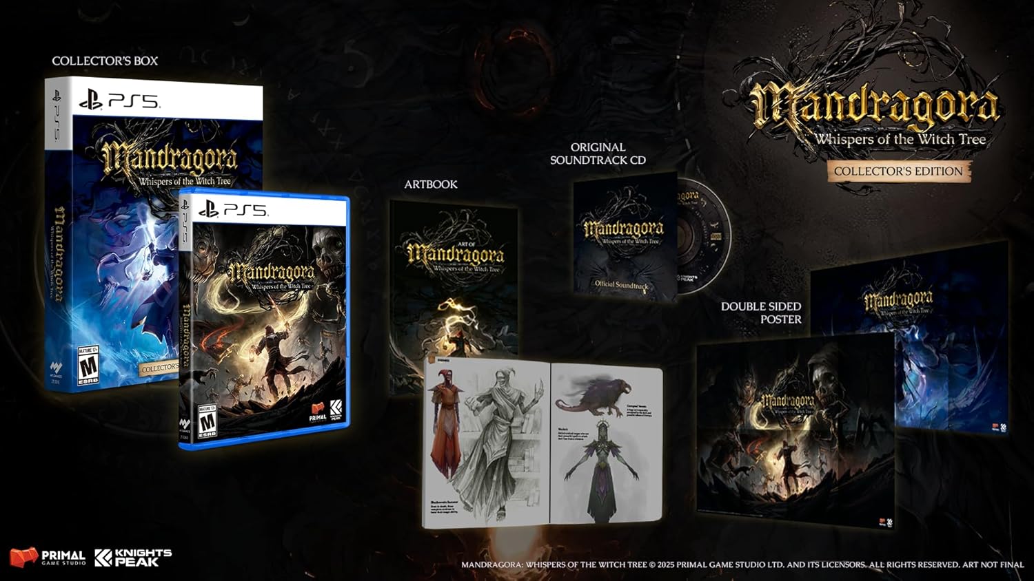 A must-have for fans of Story-Driven Action RPGs, the Mandragora: Whispers of the Witch Tree – Collector´s Edition includes the following: An exclusive Art Book showcasing never-before-seen illustrations. A CD Soundtrack featuring the haunting Original Soundtrack (OST) composed by Christos Antoniou (from the Greek metal band Septicflesh) and primarily performed by the FILMharmonic Orchestra of Prague! A double-sided poster. The physical game And a collectible tuck-in box housing all the contents