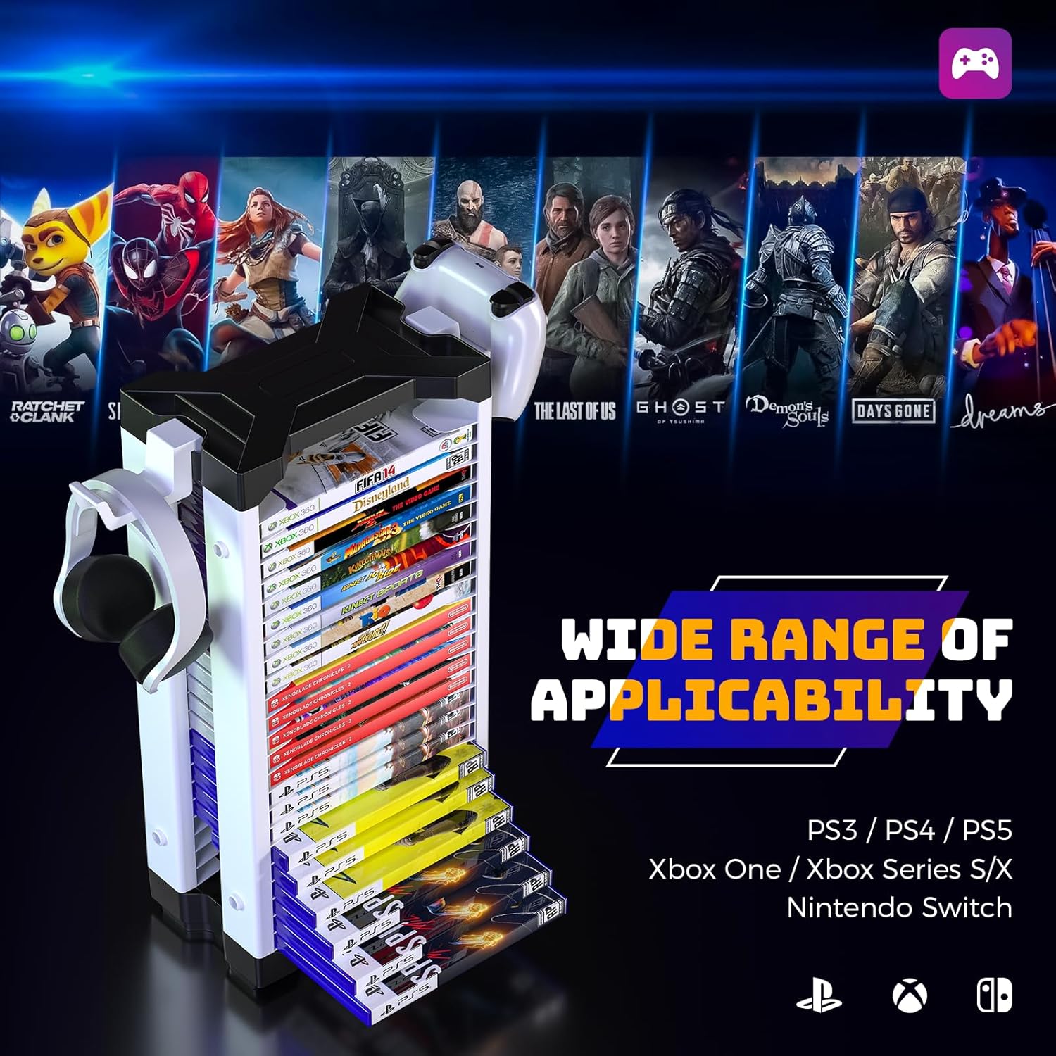 Universal Compatibility: The PS5 game holder is a great desk organizer of various game disk, compatible with PS3, PS4, PS5, Xbox One, Xbox Series X / S, Nintendo Switch games as well as Blu ray storage.