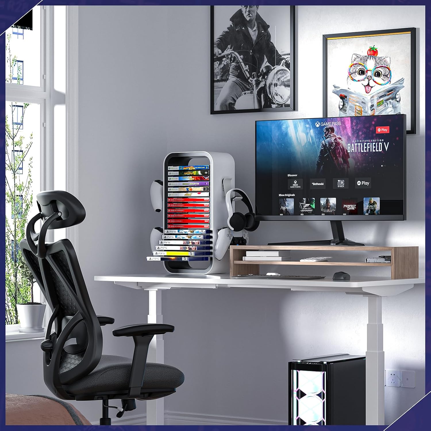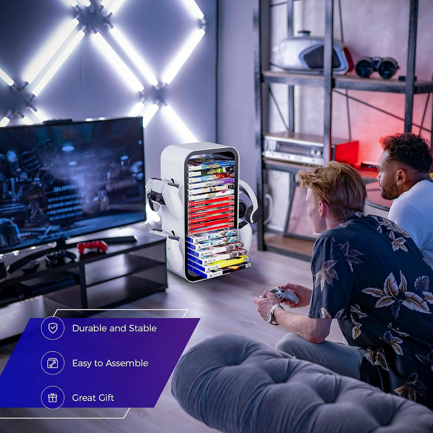 【Excellent Compatibility】Compatible with Switch, PS4, PS5, Xbox One, and Xbox Series X / S games. Extra 4 holders available for controllers or headphones on both sides. The game storage tower is a must-have for video gamers, perfect as a holiday gift or birthday gift for your gaming fan friend.