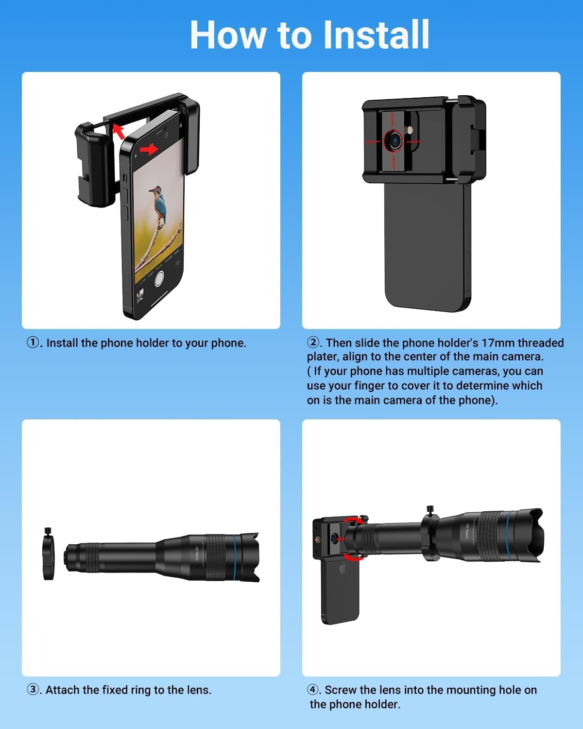 【Ultra-long-distance photography】The 60X telephoto lens equipped with an extension tripod and bluetooth shutter. The extension tripod made of aluminum alloy, have 4-section multiple heights and adjustable extended from 17″-54″. And the bluetooth shutter allows you to take pictures or videos away from a distance of up to 30ft(10m), assembled to completely release hands. Ideal for outdoor long-distance, long time shooting