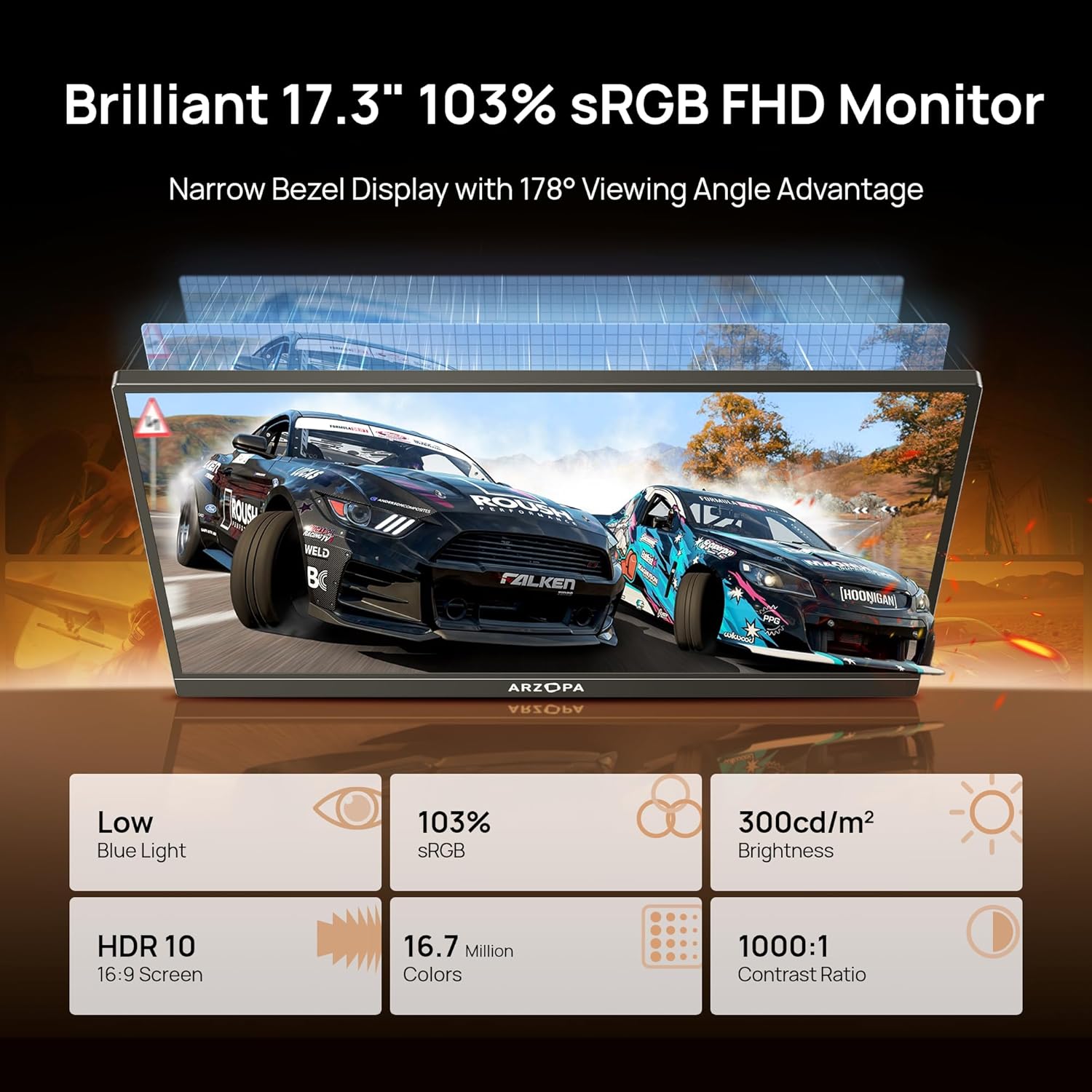 Immersive Gaming Experience: Immerse yourself in stunning visuals with the ARZOPA monitor’s expansive 17.3″ display and 103% sRGB IPS screen, delivering vibrant colors and high gamut color accuracy for an astonishing viewing experience. Whether you’re exploring vast virtual worlds or engaging in intense battles, this monitor is perfectly suited for gaming, providing smooth game play and responsive visuals that elevate your gaming sessions to new heights