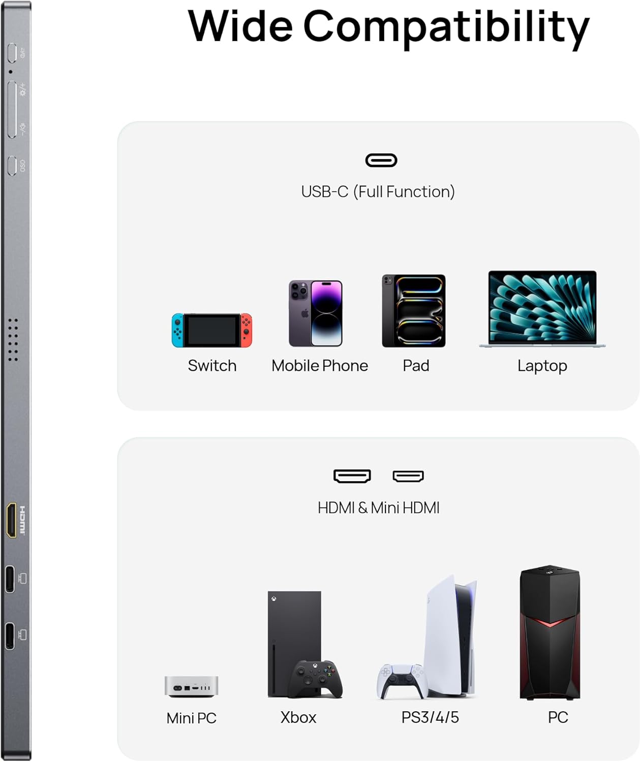 [Seamless Compatibility] With USB-C and mini HDMI ports, it connects seamlessly to laptops, gaming consoles, phones, and more. Offers multiple display modes: duplicate, extend, second screen. Supports plug-and-play connectivity. Ensuring stable data transmission