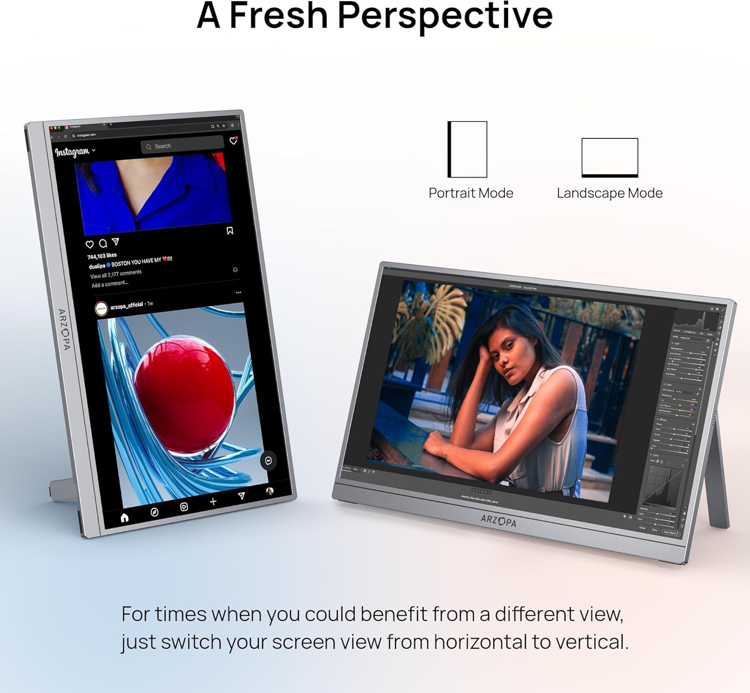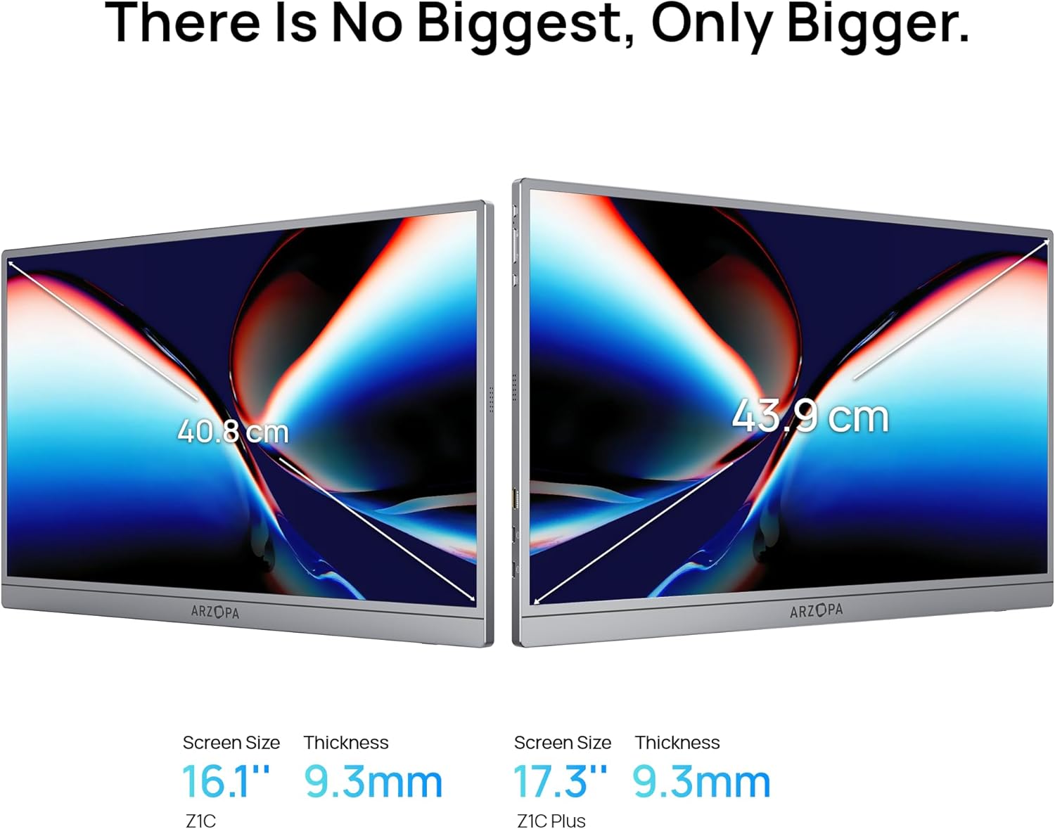 [Superior 17.3 inch Large Display] ARZOPA Z1C PLUS portable laptop monitor, larger screen offers a more perfect 16:9 proportion which providing extra visual space for multitasking, gaming, or content viewing. The increased size eliminates the cramped feel of smaller monitors, making every interaction comfortable and immersive