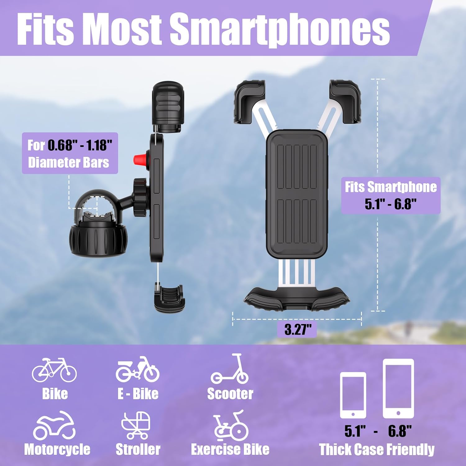 Multi-device compatible – Fits 5.1–6.8 inch smartphones. Works with bicycles, motorcycles, e-scooters, e-bikes, strollers, shopping carts, treadmills, and more. Compatible with handlebar diameters 0.68–1.18 inches.