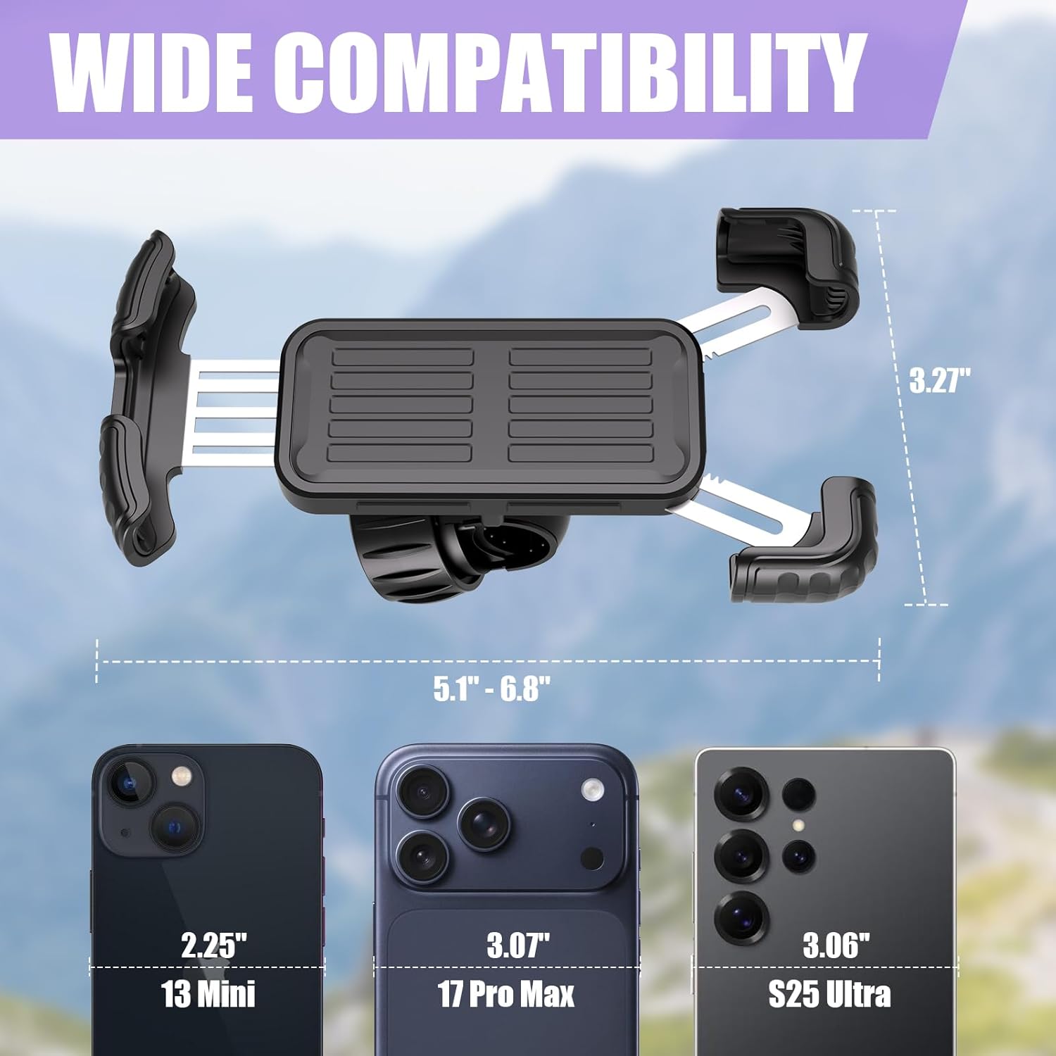 Multi-device compatible – Fits 5.1–6.8 inch smartphones. Works with bicycles, motorcycles, e-scooters, e-bikes, strollers, shopping carts, treadmills, and more. Compatible with handlebar diameters 0.68–1.18 inches.