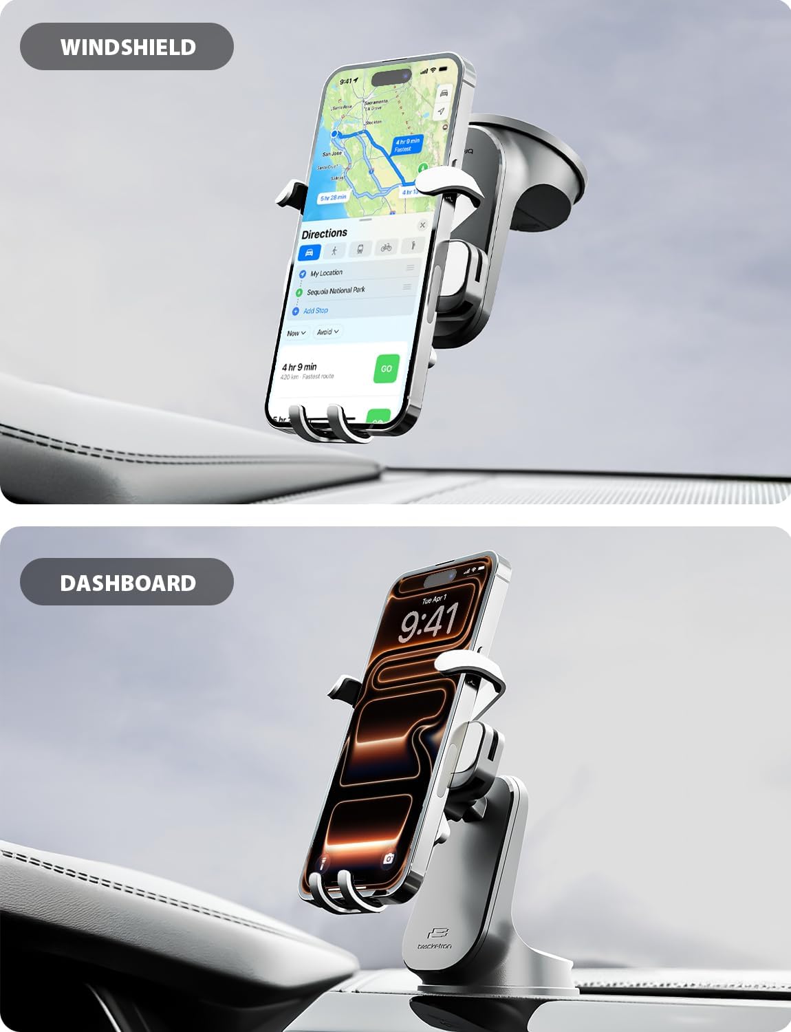 Dash & Windshield Phone Mount – Dual Installation Options. Features both dashboard and windshield phone mount capabilities. This windshield phone mount attaches securely to glass surfaces while the dash mount provides stable desktop placement. A versatile phone mount car solution for any vehicle setup.