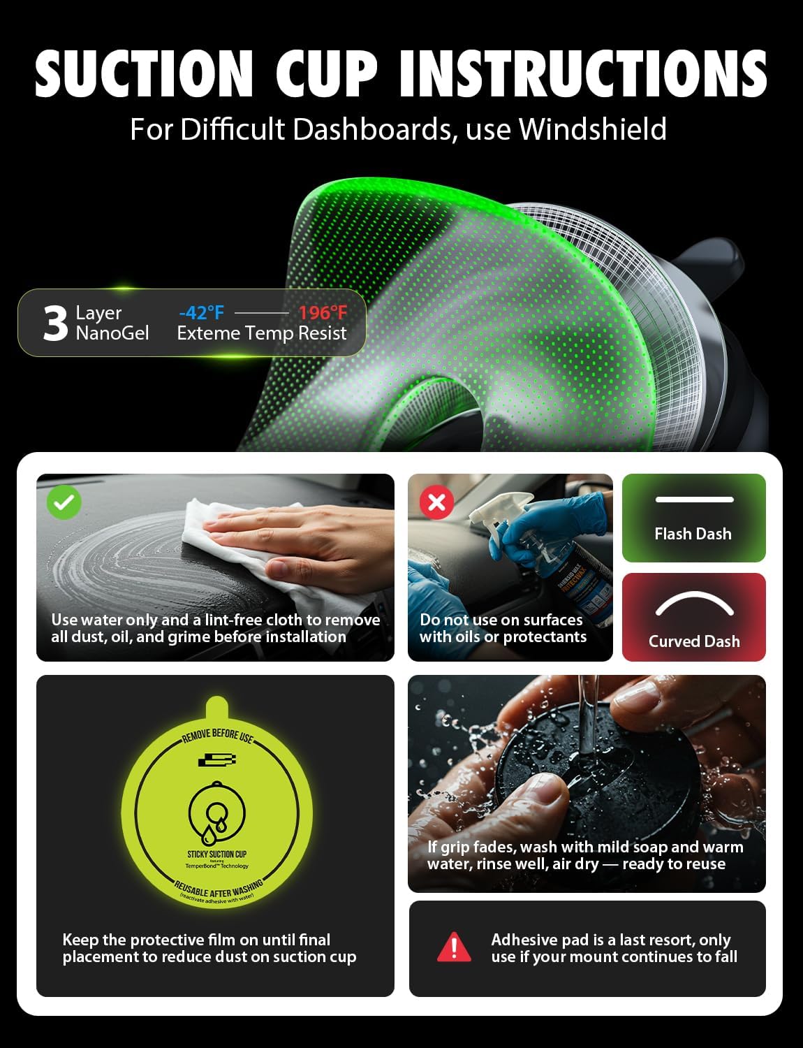 Approved Mounting Surfaces – Flat, non-porous dashboards and windshields only. Lightly textured surfaces can hold, but medium/heavy textures or sloped areas are not permitted. In hot or high-UV climates, dashboard surfaces can exceed suction ratings and cause lifting—mounting directly to the windshield provides the most secure, heat-resistant installation. If grip weakens, clean the suction cup with mild dish soap and warm water, rinse, air dry, and reuse like new.