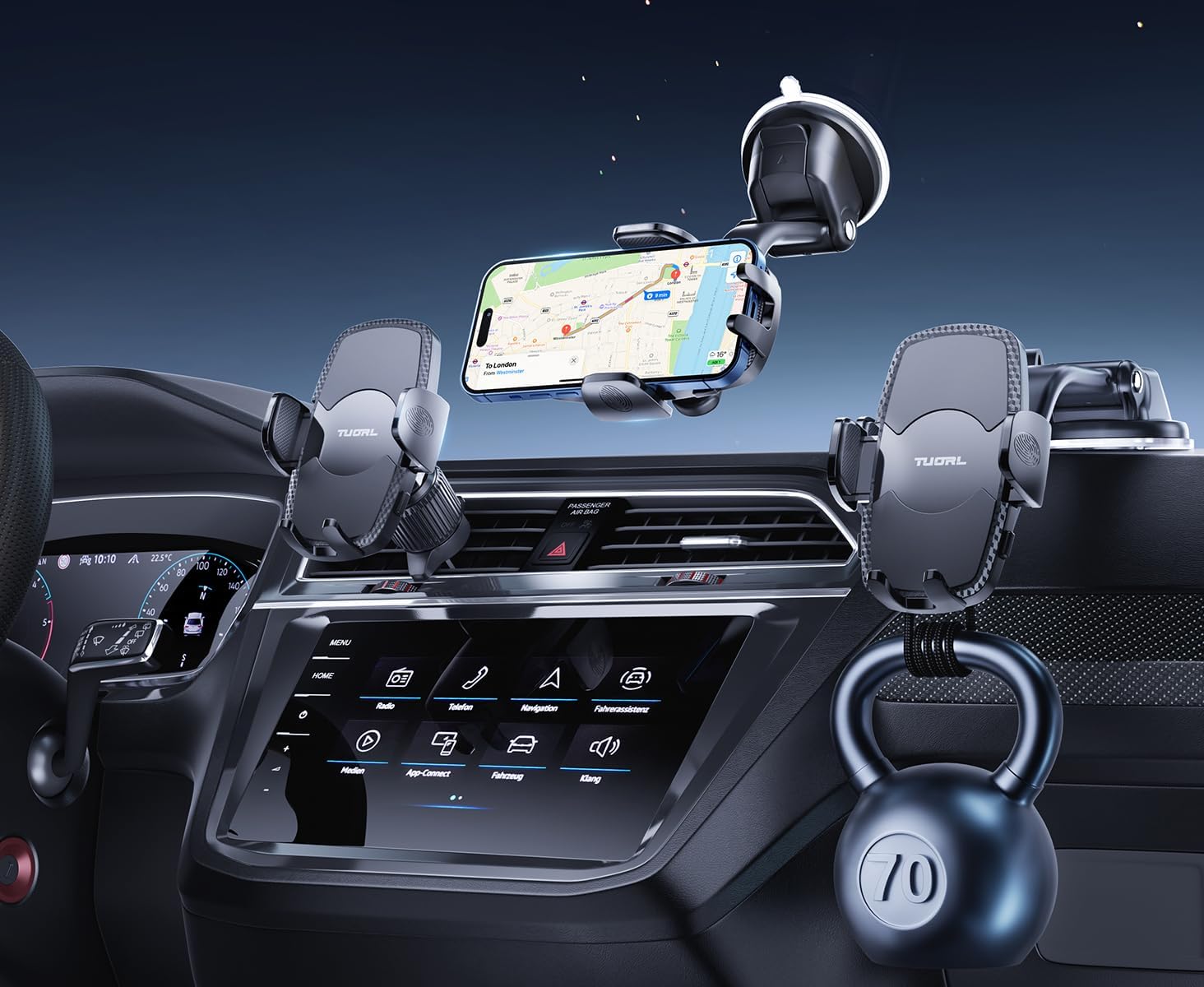 【3-in-1 Design, Ideal for Diverse Vehicles】TUORL hands-free phone mount for car offers a 3 in1 installation design (dashboard, windshield, air vent), suitable for cars, trucks, SUVs, taxis, and even boats. With optimized positioning, it ensures clear visibility, enhancing navigation safety across various scenarios.