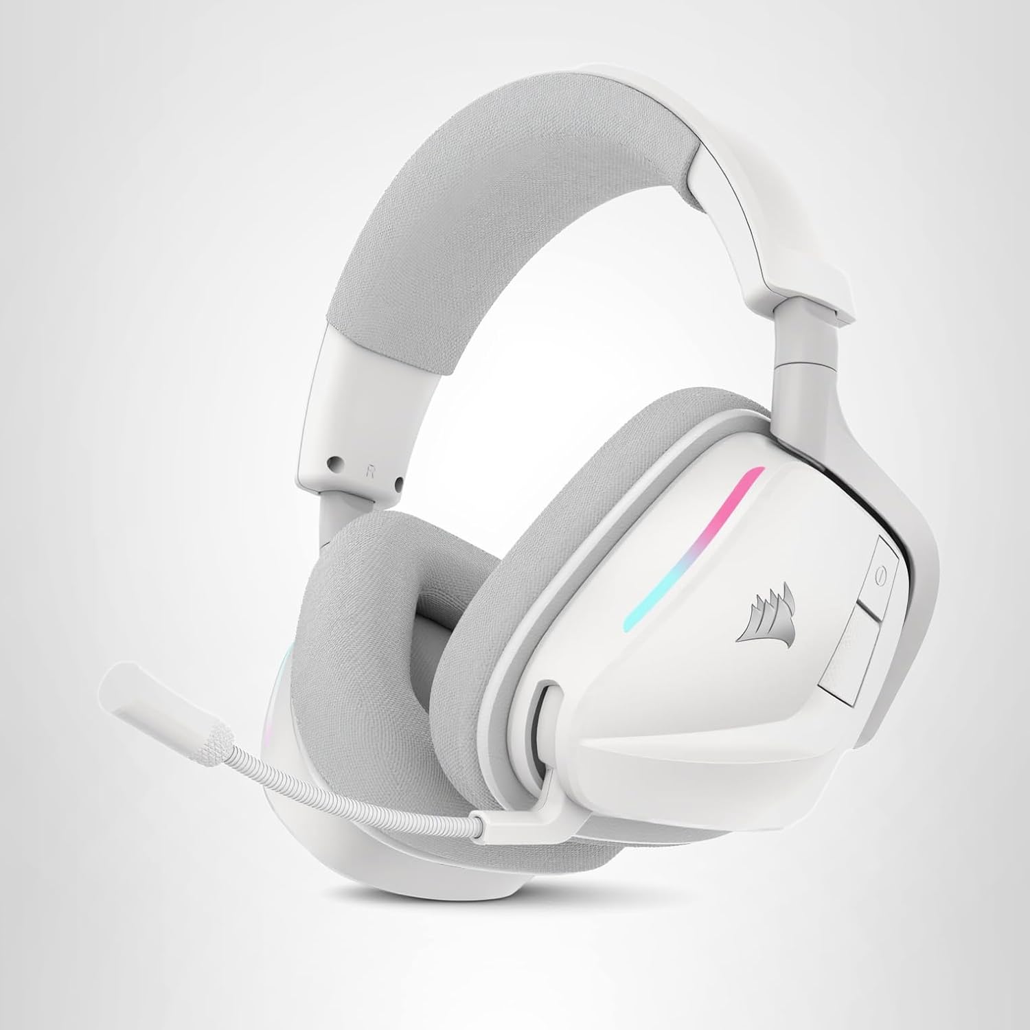 Hear everything around you in your favorite games with custom-tuned 50mm drivers and Dolby Atmos® Spatial Audio. Stay connected with ultra-fast 2.4GHz wireless* or Bluetooth®, and game longer with up to 70 hours of battery life. Quickly charging for just 15 minutes adds 6 more hours of battery life. Designed for PlayStation 5, PC, and more, VOID WIRELESS v2 offers multiplatform compatibility and breathable memory foam ear cushions for all-day comfort. The omni-directional microphone has NVIDIA Broadcast® technology** which ensures your communication is clear and noise-free. On-ear controls let you mute, adjust volume, or switch modes instantly, while iCUE software gives you full control over sound and RGB lighting. *via 2.4GHz wireless and RGB off. **Requires a compatible NVIDIA GeForce RTX™ graphics card. Technical Specifications Headphones – Frequency Response: 20Hz – 20 kHz, Impedance: 32 Ohms @ 1kHz, Sensitivity: 116dB (± 3 dB), Drivers: 50mm Neodymium Microphone – Type: Omni-directional, Impedance: 2.2k Ohms, Frequency Response: 100Hz – 10kHz, Sensitivity: -40 dB (± 3 dB) Wireless – USB Wireless Receiver: USB Type A, Headset: USB Type C, 2.4Ghz Wireless Range: Up to 50 feet (15m), Bluetooth Wireless Range: Up to 30 feet (9m), Bluetooth Radio Version: Bluetooth 5.3, Bluetooth Profiles: A2DP, HFP, HSP, Battery Life: Up to 70 hours on 2.4GHz Dimensions: 105(L) x 170.5(W) x 193(H) mm / 4.13”(L) x 6.71”(W) x 7.60”(H), Product Weight: 303g / 0.67 lb Package Contents CORSAIR VOID WIRELESS V2 WIRELESS Headset, Wireless USB Receiver, USB Charging Cable (1.8m), Safety Leaflet, Warranty Card