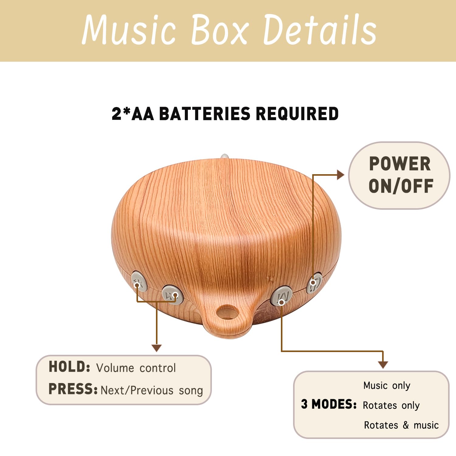 【About Music Box】This music box is made of non-toxic, durable ABS material for baby’s safety. It offers 12 different lullabies, creating a harmonious and relaxing atmosphere to help babies unwind quickly. Equipped with four buttons – power, M, and two volume buttons. The M button switches modes. Press and hold volume buttons to adjust volume or short press to change songs. Volume is freely adjustable. Three modes available: rotation only, music only, and rotation with music. Automatically shuts off after 30 minutes to save power. Requires 2 AA batteries (not included).