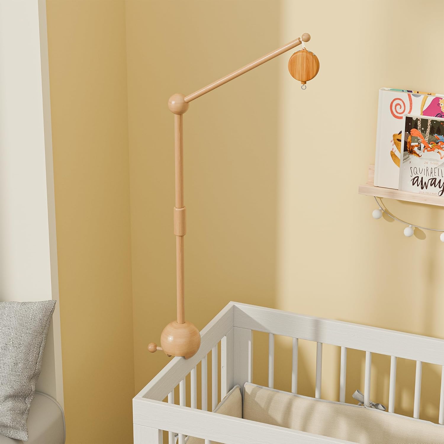 【About Mobile Holder】The baby crib mobile holder is made of 100% natural beech wood and is sprayed with environmentally friendly water-based paint on the surface, which is very sturdy and durable. The height of the holder can be adjusted in two modes of 22.5 and 32.5 inches, and the connecting ball on the top can rotate 360°, which greatly enhances the functionality and adaptability of this baby crib accessory. (Note: Applicable to baby crib guardrails with a thickness < 1.7 inches)