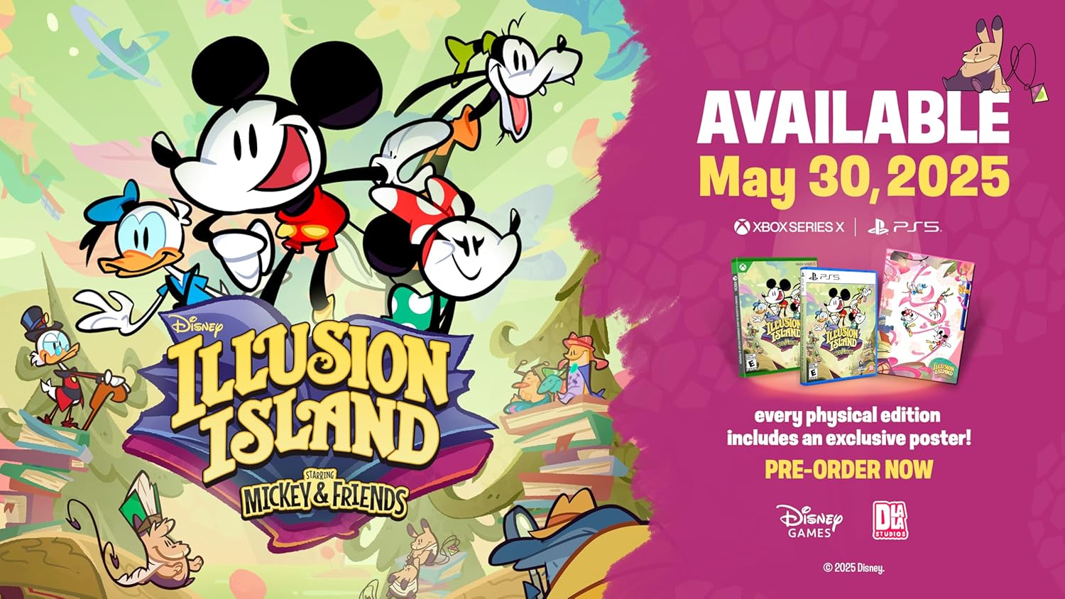 Every Physical Edition comes with an Exclusive Disney Illusion Island Starring Mickey & Friends Poster while supplies last Story Overview The Fab Four, Mickey Mouse, Minnie Mouse, Donald Duck, and Goofy, have been summoned to the mysterious island of Monoth to embark on a dangerous mission. Three magical Tomes – powerful books used to protect the island – have been taken, throwing Monoth into chaos! Vowing to be the heroes Monoth needs, Mickey & Friends set off on a perilous quest to explore this vast, unknown world to recover the mystical books. But the journey will not be easy, and with intrigue afoot, not everything is what it seems on this “Illusion Island”! Game Overview Join Mickey & Friends as they explore the mysterious island of Monoth, on a quest to recover three mystical books and save the world from disaster! In this brand new 1-4 player cooperative adventure platformer, you’ll navigate as Mickey Mouse, Minnie Mouse, Donald Duck and Goofy through a beautifully hand-crafted world. Unlock powerful abilities, discover hidden secrets, and meet a cast of original characters as you travel through the never-before-seen island of Monoth Featuring fully-voiced animated cutscenes and a magically orchestrated original score, Disney Illusion Island is Mickey’s triumphant return to games, and this time, he brought friends!