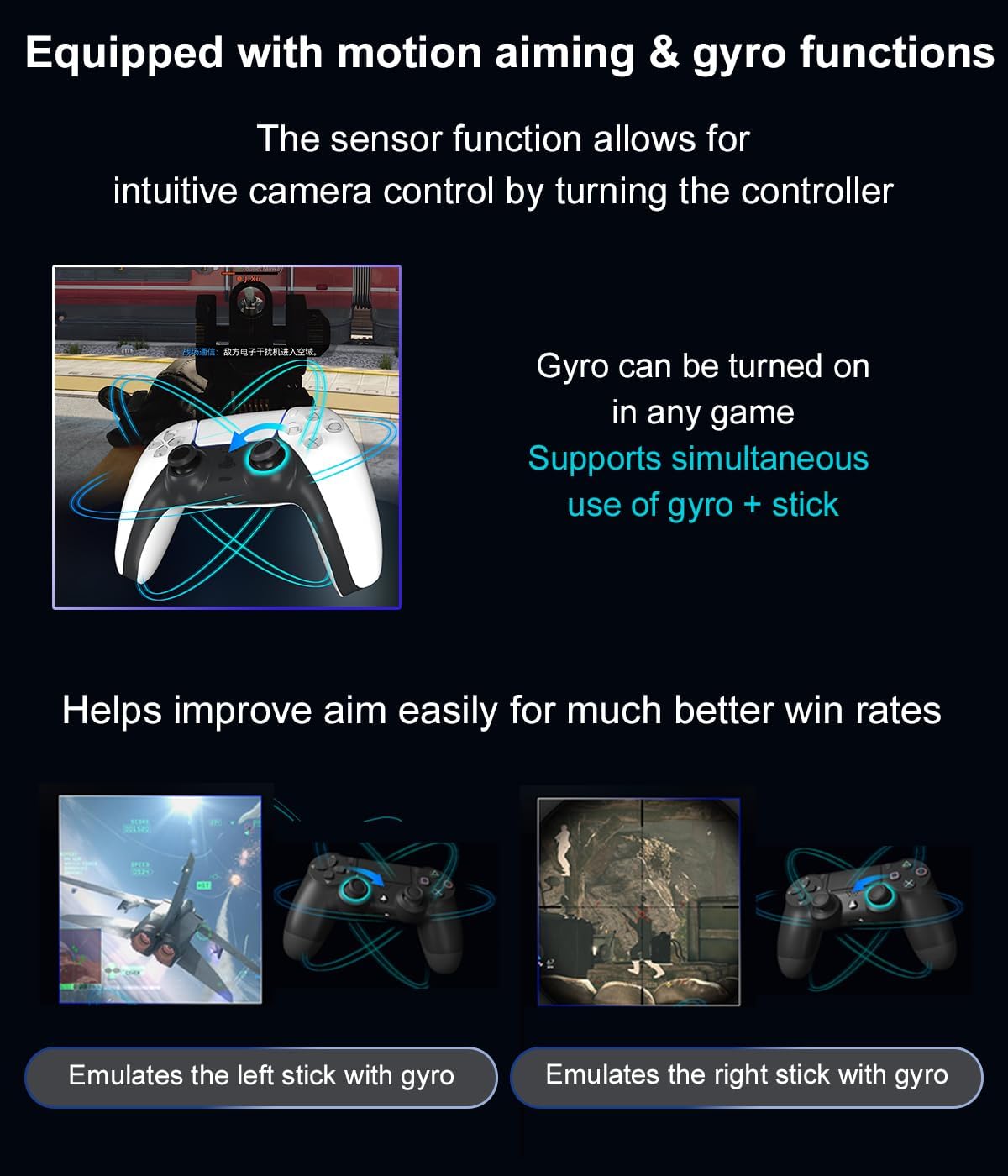 【Equipped with high-precision macros】motion aiming & gyro functions, Button Mapping, Combo/Rapid Fire, Recoil Reduction, Automatic Looping, two-player play, Controller vibration function, Reproduces all functions of the touchpad