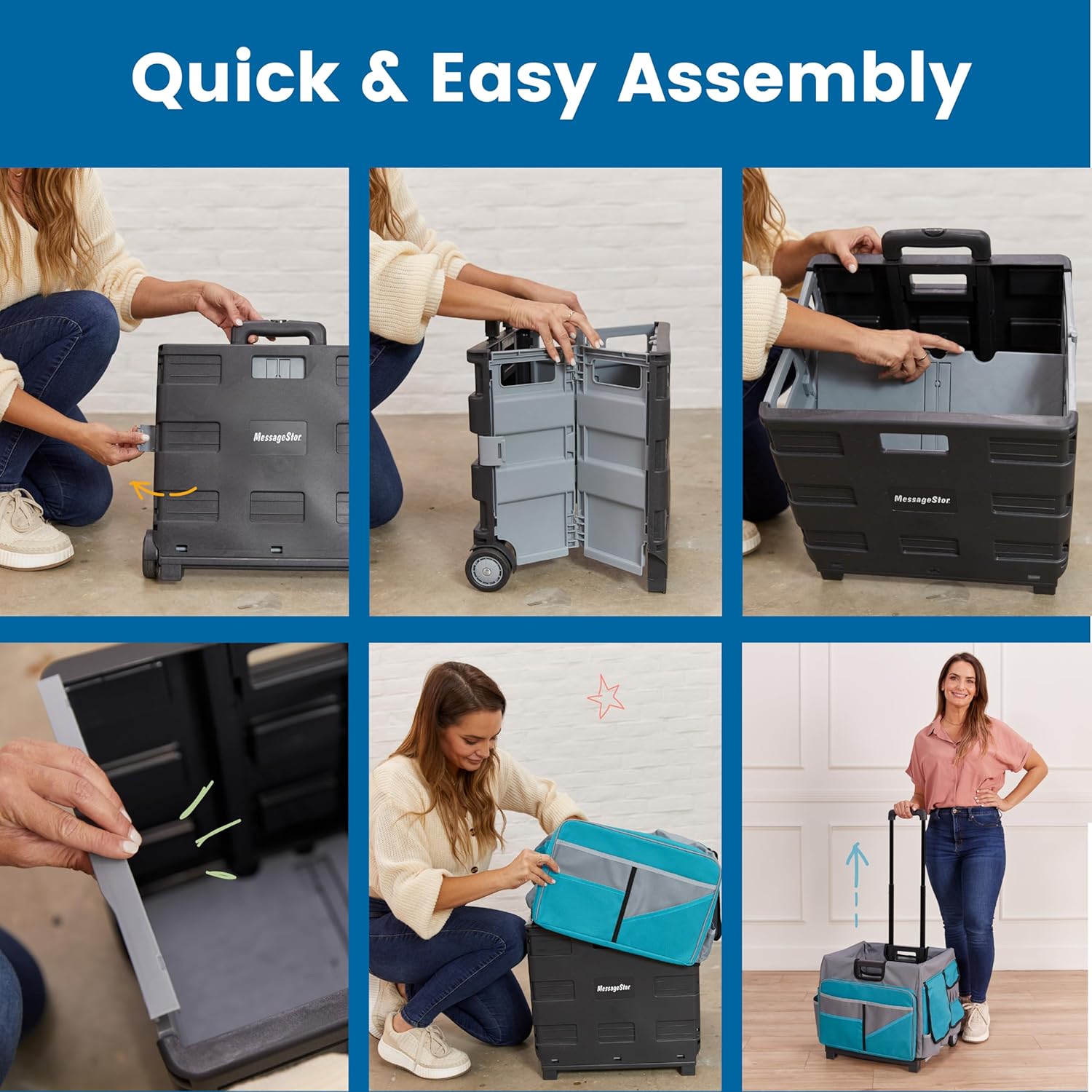The ECR4Kids Universal Rolling Cart with Organizer Bag is the ultimate mobile solution for transporting school supplies, files, and textbooks. In addition to being a teacher toolbox for classroom organization, the rolling storage cart can be used to organize arts and crafts supplies, scrapbooking material, sewing supplies, tools, photo albums, garden equipment, or cleaning supplies. This versatile handcart effortlessly unfolds, locking into place with double-sided stability rails that reinforce side panels. The rails conveniently store in the base when not in use. Built-in handles allow for easy lifting, while heavy-duty rolling casters ensure smooth and effortless transport. The removable saddlebag organizer slides over the cart, featuring over 30 storage compartments, zippered pockets, and stay-put fasteners to keep your supplies secure and within reach. The carts with wheels accommodate letter and legal-size folders, hanging files, and binders, making it an essential tool for staying organized on the go. The ergonomic retractable handle extends and locks into three positions, ensuring comfortable use whether you’re heading to school, meetings, or running errands. When not in use, the rolling carts with wheels fold into a compact square for space-saving storage, making it as practical as it is functional.