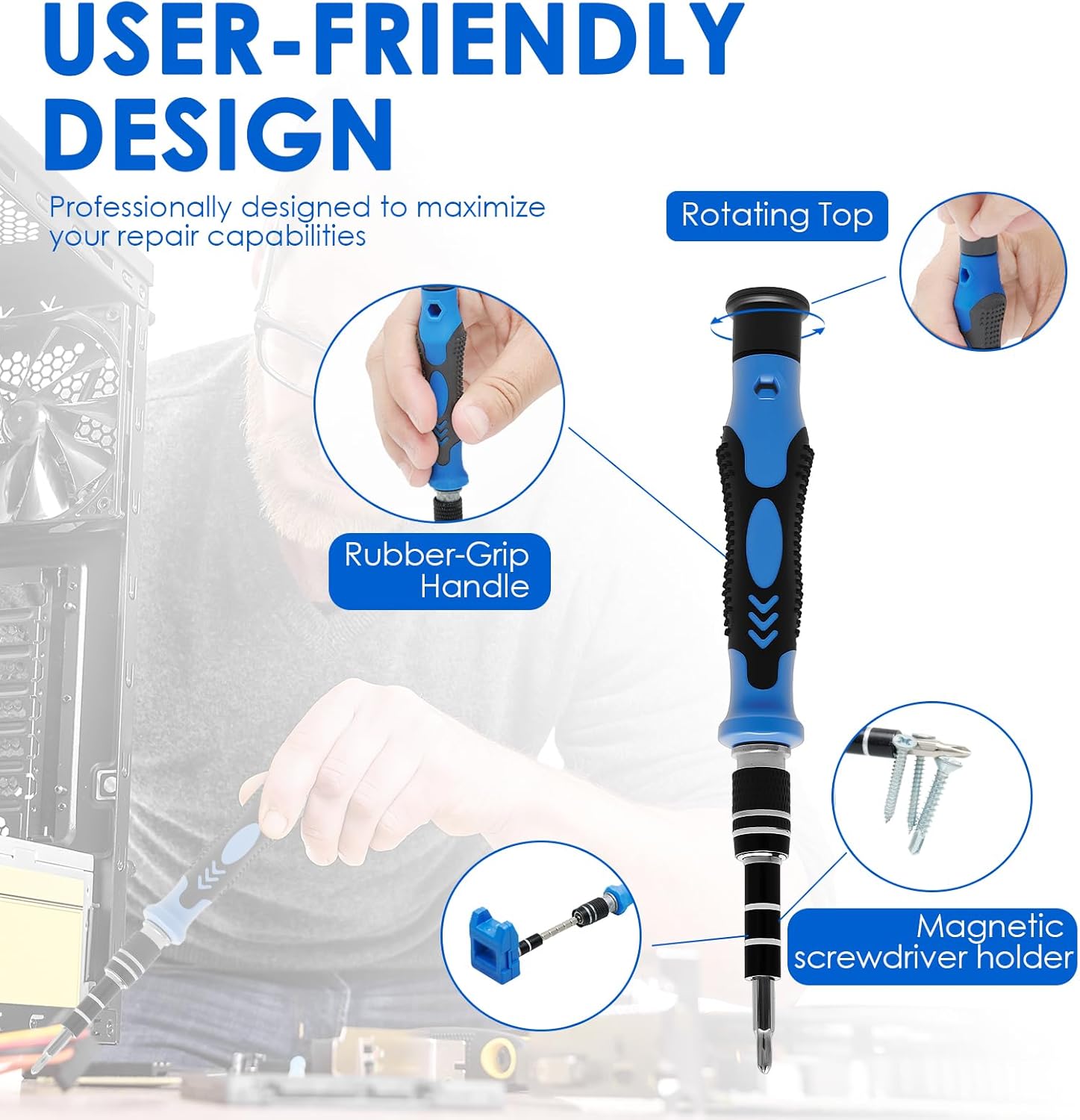 Rotating Rubber Handle: The screwdriver is equipped with a rubber handle with a rotating top, providing a comfortable grip and smooth rotation. The magnetic bit holder transmits magnetism through the screwdriver head, helping you handle tiny screws, and the flexible extension shaft can be used to remove screws at tight points. Professional design, in order to maximize your repair capabilities.
