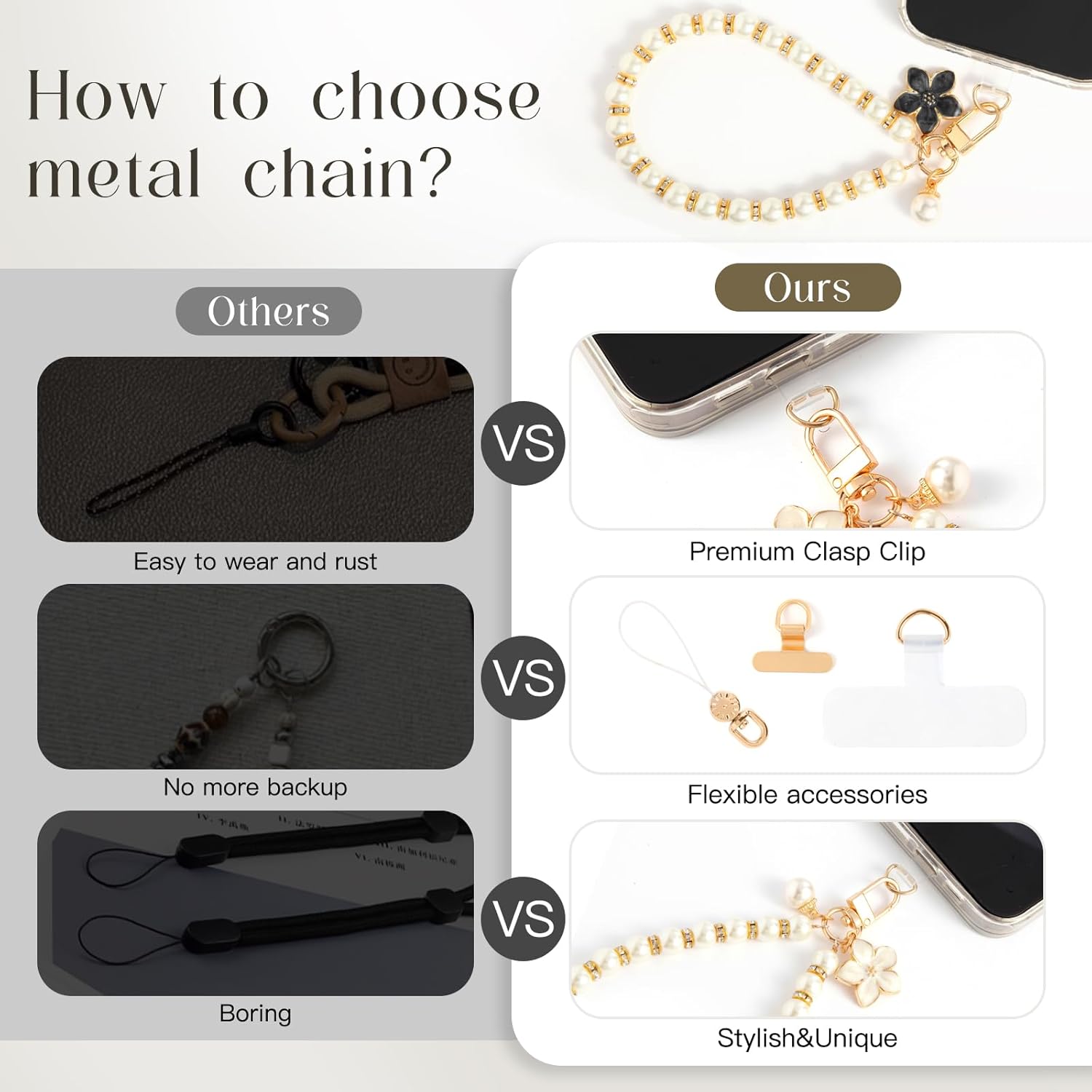 1. **Stylish & Functional Design:** This chic phone strap combines lustrous pearls and sparkling crystal-encrusted gold spacers, finished with a detachable ABS pear flower charm (white or black). Perfect for adding a touch of elegance to your phone while keeping it secure. Its unique design stands out among generic phone straps, making it a fashionable accessory for any occasion.