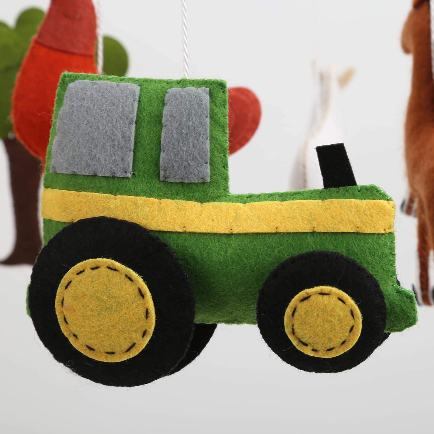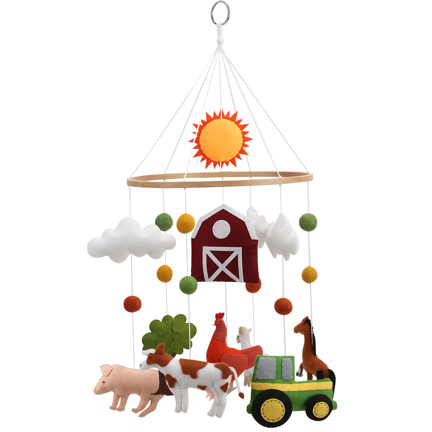 A beautifully farm crib mobile, completely gender neutral baby mobile with lots of color. Bring your nursery to the sunny farm with this farm animal mobile!. Including your favourite animals cow, pig, rooster and horse with barn and tractor! Use with other farm baby stuff and baby farm animal nursery decor. The high contrast colors of the farm animal mobile can distract and settle your baby helping them drift off into animal themed dreams. Attach to various crib mobile arms (not included) or hang from the ceiling but remember to keep out of reach of children. A gentle spin will keep the mobile moving in soft motion for enough time to gently settle your baby for a peaceful sleep.