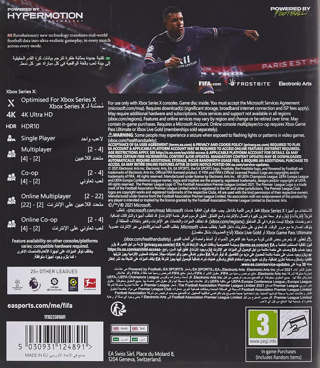 Powered by Football, EA SPORTS FIFA 22 on PlayStation 5 and Xbox Series X|S moves the game forward with groundbreaking next-gen HyperMotion gameplay technology that elevates every moment on the pitch. HyperMotion integrates advanced full-team mocap data and machine learning to heighten gameplay in every match in FIFA 22, harnessing the power of next generation consoles to deliver the most realistic, responsive and fluid gameplay experience we’ve ever built. FIFA 22 brings a new season of innovation across every mode in the game; enjoy more consistency between the posts with a goalkeeper rewrite that brings more composure to the most important position on the pitch, live out your football dreams as you create and manage your custom club to glory in Career Mode, get rewarded for your flair with restyled gameplay in VOLTA FOOTBALL, welcome back football’s most memorable players as FIFA Ultimate Team Heroes, and feel the atmosphere of your next big game with the most immersive matchday experience ever seen in EA SPORTS FIFA.