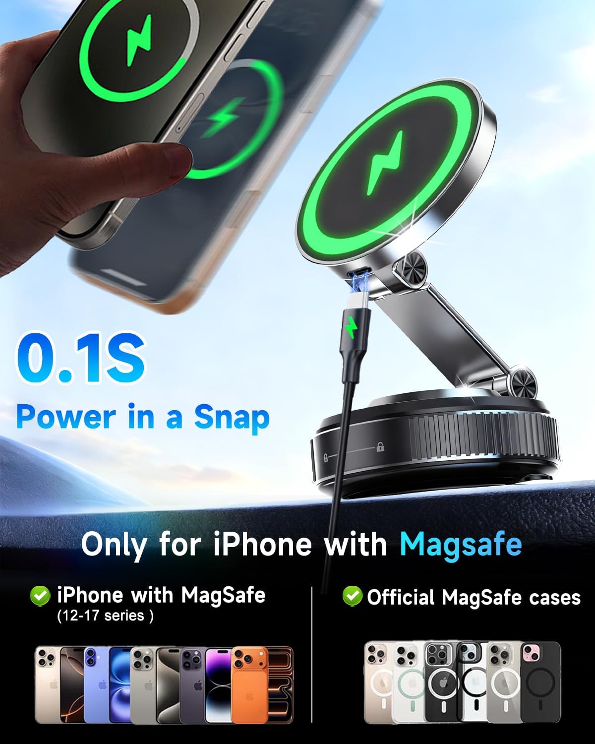 for MagSafe Car Mount Charger, 15W Fast Charging Magnetic Wireless Car Charger, Vacuum Magnetic Phone Holder [120LBS Ultra Suction Cup & 3000gf Magnet ] 780° Dashboard Car Bracket for iPhone & Android