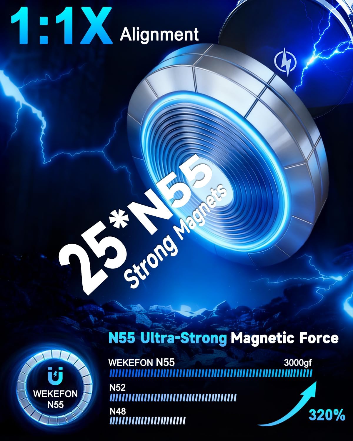 【2026 Upgrade N55 Ultra-Strong Magnetic Hold】 Our magnetic wireless car charger suction cup phone mount features 25 high-performance N55 magnets, delivering 320% stronger magnetic force than standard magnets. Providing a top-tier hold with up to 3000gf of force, It can support the weight of up to 62 phones, and precisely 1:1 aligns with your phone’s built-in magnets, After 10000 vibration tests and extreme road and weather simulations, your phone 100% stable secure and charging normal during bumps, sudden stops, or sharp turns. Secure your phone with magnets for easy GPS navigation, calls, or quick video access.