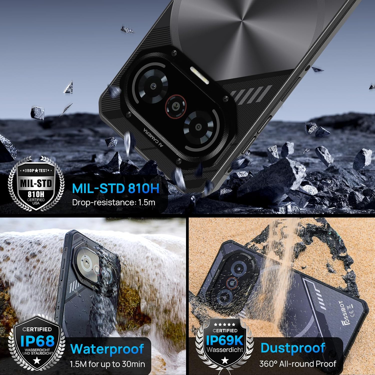 FOSSIBOT F114 Rugged Phone Unlocked, Android 15, 6.67″ 90Hz HD+ Display, 16GB RAM 128GB/1TB ROM, 50MP AI Camera, IP68/IP69K Waterproof, NFC,Outdoor Gaming Smartphone(2025 Black)