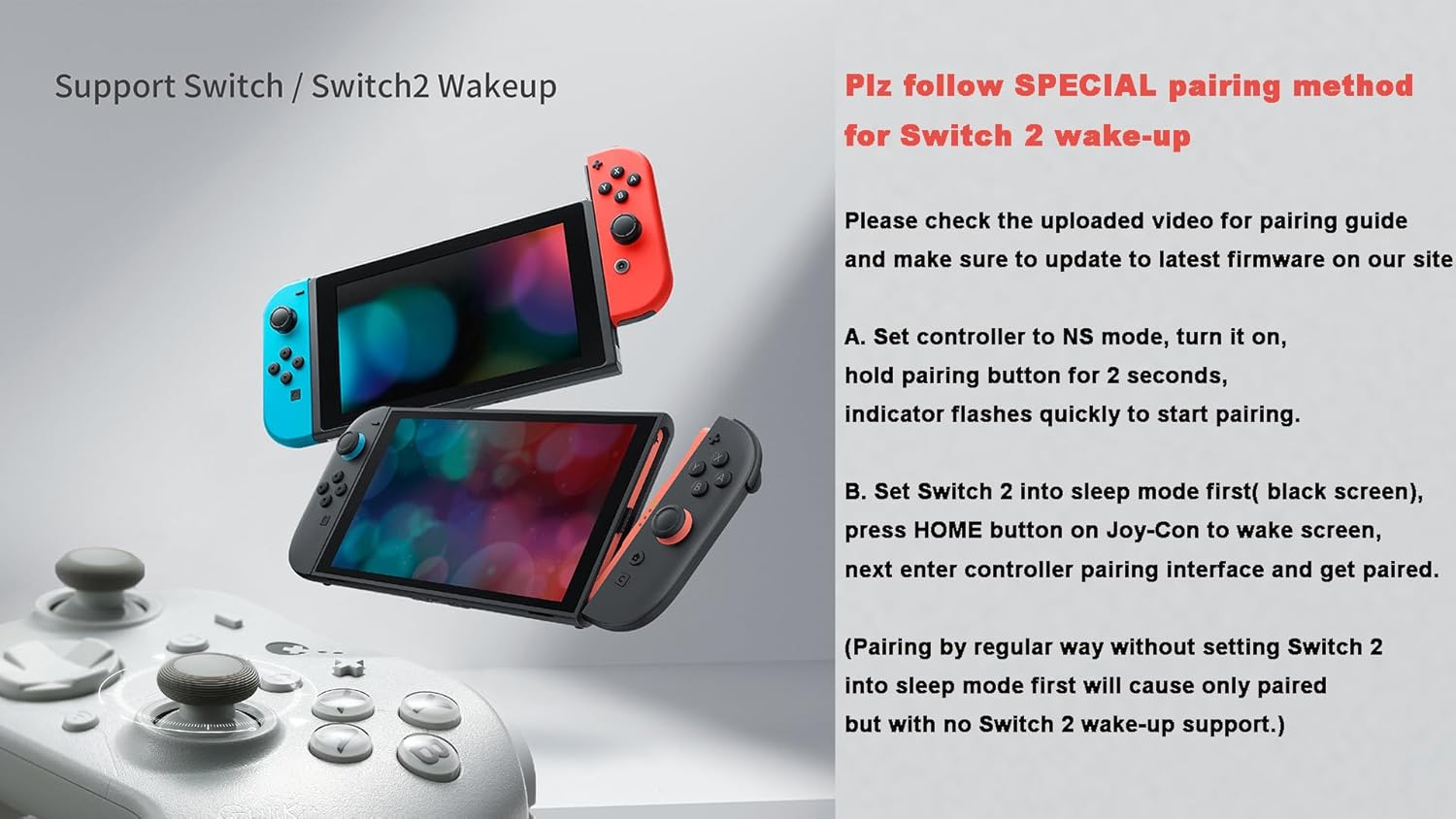 NOTE: Please follow SPECIAL pairing method for Switch 2 wake-up