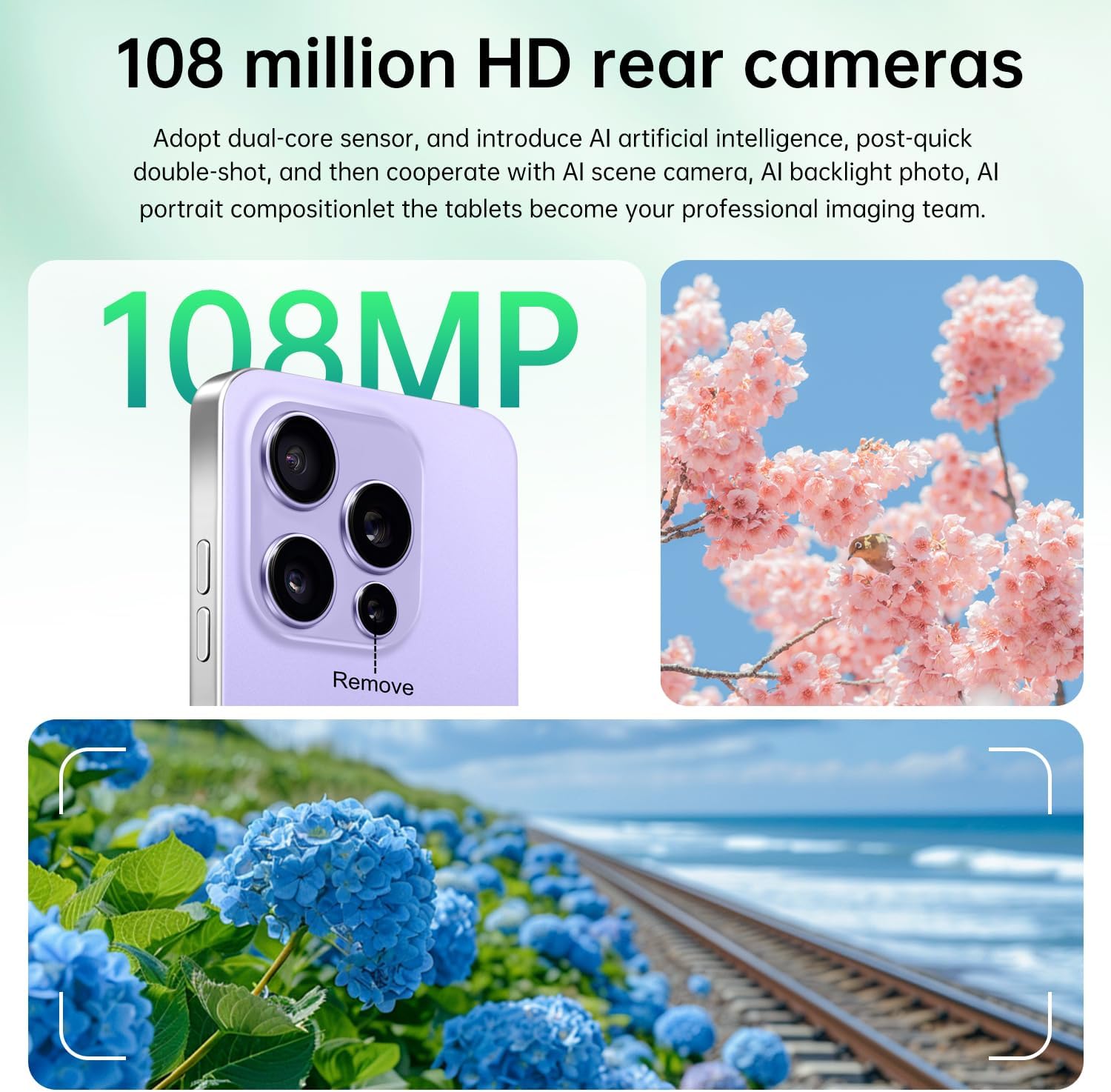 【6.99 HD+ Android 14.0】 This is an Android Cell phone with a large screen,6.99”HD+ Display 1440*3040,This unlocked Android 14.0 16PROMA X phone is equipped with a 108MP main camera and a 68MP front facing camera, And it has facial recognition and Fingerprint button unlock and Quick button for taking photos, which effectively protect your privacy.