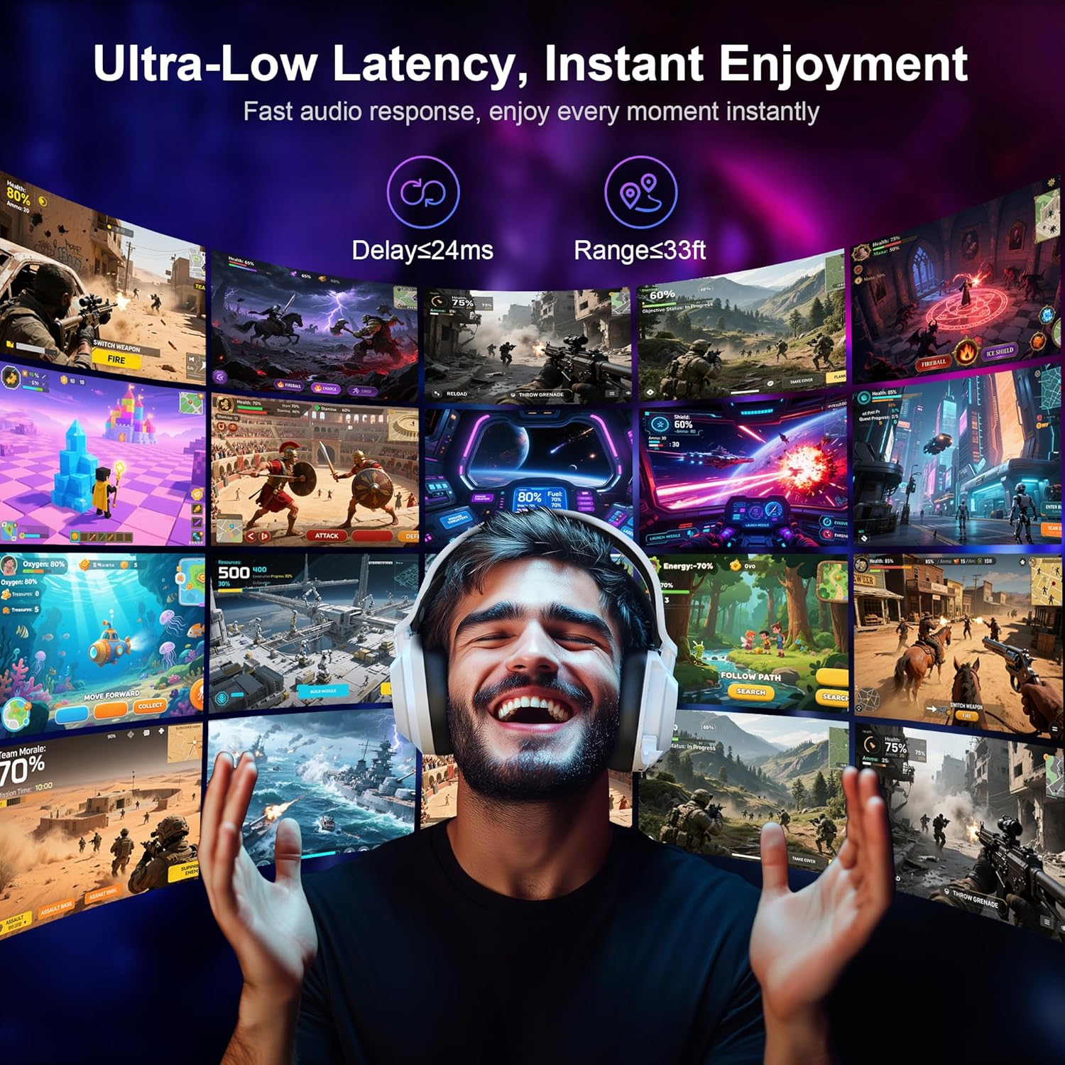 【Multi-Platform Compatibility】Gaming headset delivers a seamless gaming experience through dual modes. 2.4GHz USB dongle for ultra-low latency on PS5, PC, PS4, laptops, and Switch (plug-and-play), plus Bluetooth connectivity(Bluetooth is not compatible with PS4/PS5). Perfect for FPS and racing games where every millisecond counts. No compatibility worries (except Xbox Series)