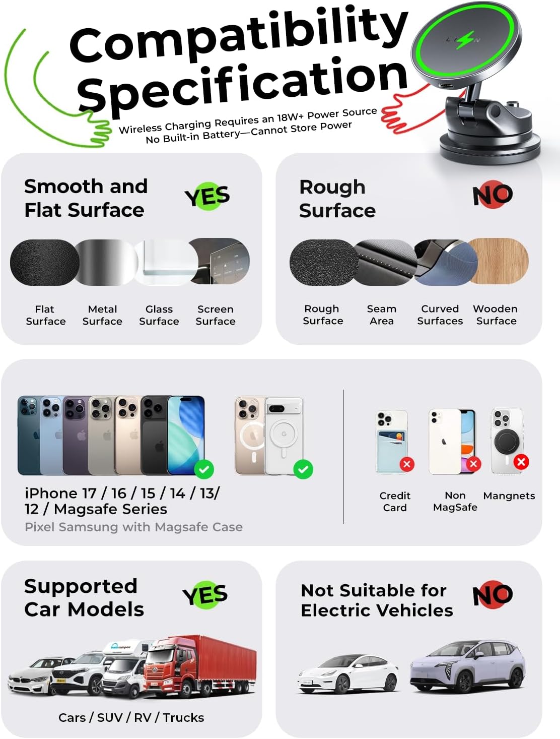 [What’s in the Box?] 1*Vacuum Magsafe suction car wireless charging stand,1*PC pad,1*3.3Ft USB A to USB C Plastic data cable,1*manual and 24/7 customer support with a 24-month for worry-free use.