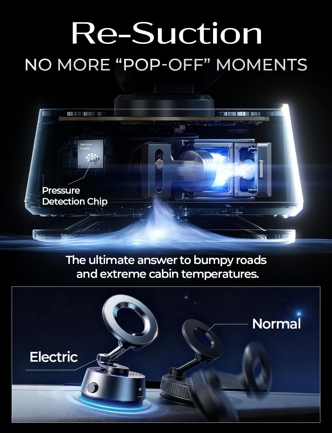 Auto-lock on contact — LISEN activates vacuum suction the moment it touches the surface. No twisting, no lever pushing needed.Smart pressure re-suction — When temperature changes cause pressure loss, it detects & re-locks automatically, while normal mounts loosen or fall.360° rotatable base — More angles, more flexibility, even works as an in-car tripod—something most suction mounts can’t achieve.