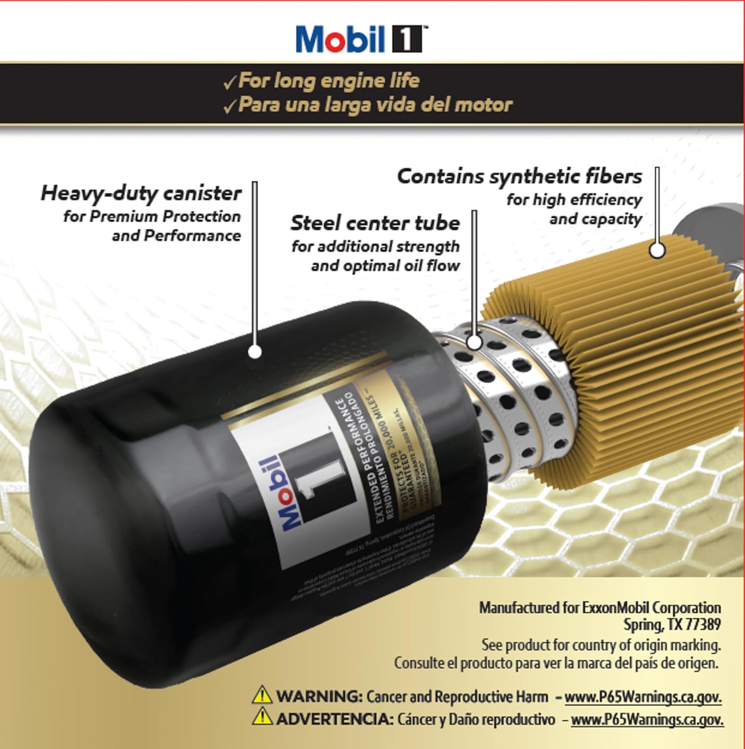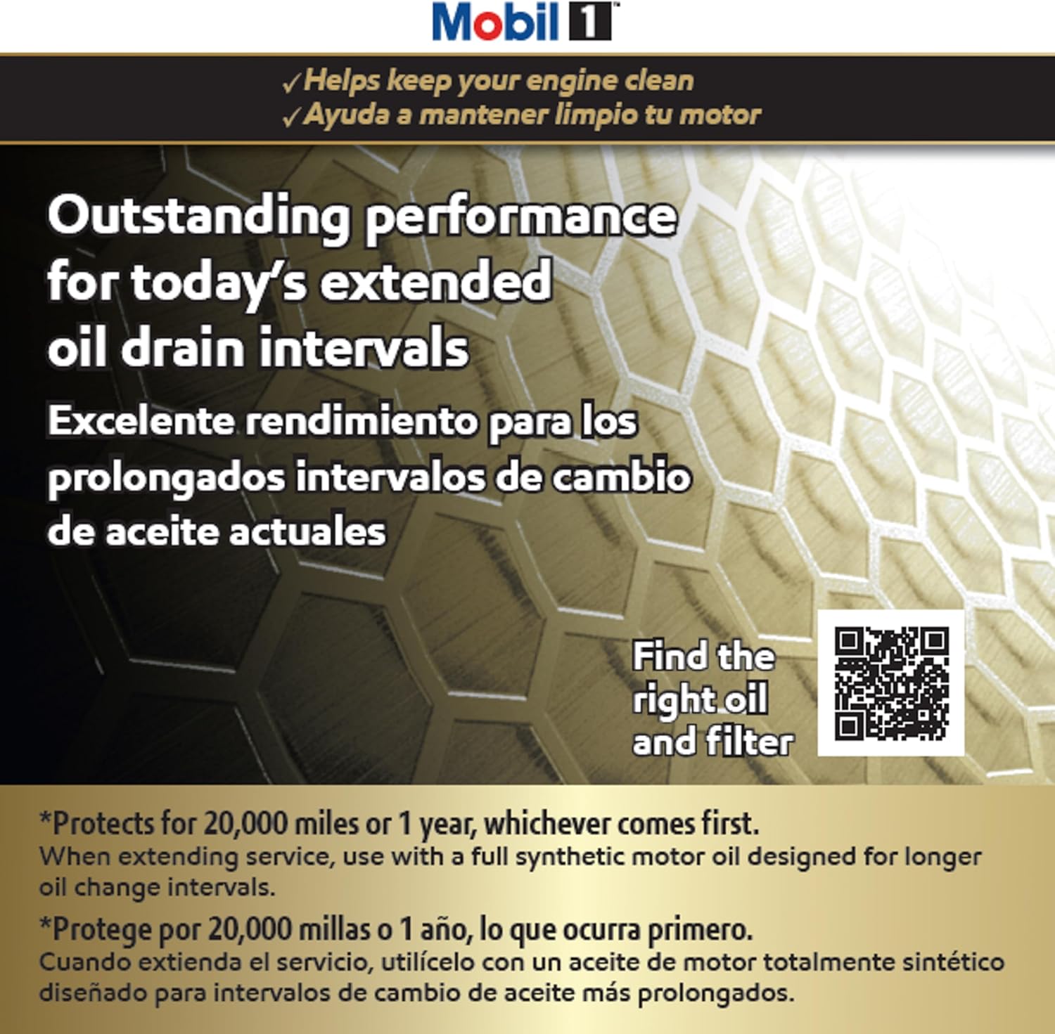 Mobil 1™ Extended Performance Oil Filters are built with strong, durable components and are tested and proven to protect 2X as long as auto manufacturers’ recommended oil change intervals. A high-efficiency synthetic blend media removes over 99% of harmful contaminants keeping oil cleaner, longer. Enhanced nitrile gasket remains pliable to help prevent oil leaks while a durable anti-drain back valve protects against dry starts. Durable, heavy-duty filter canister withstands 9X the normal vehicle oil system operating pressure. These are just some of the advanced technologies that go into making an oil filter that can provide proven protection for up to one full year or 20,000 miles. Meets requirements of the Mobil 1™ annual protection limited warranty.