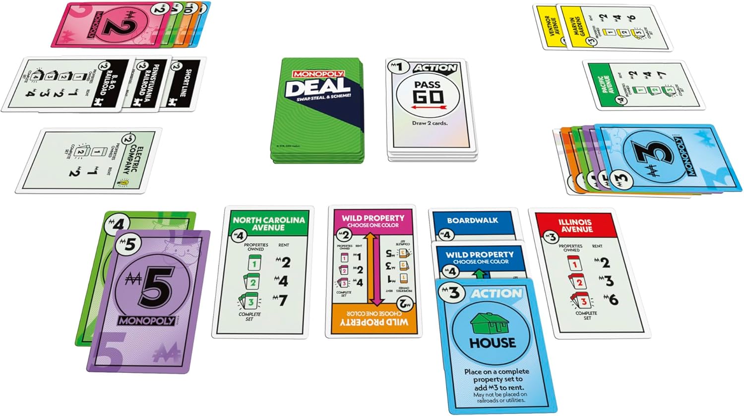 This deluxe edition of the Monopoly Deal game is packaged in a decorative tin case, great for storage, travel, and gifting. The first to collect 3 different property sets—each a different color—wins. Swap, steal, and scheme to make a fortune fast! Action cards mix up the game by letting players collect rent, take or trade properties, and more. Easy to learn, this family game for kids ages 8+ and adults can be played in as little as 15 minutes. It’s a fun kids card game for game nights with family and friends. Monopoly card games and family games are also great kids gifts for birthdays and holidays. For 2 to 5 players. The Hasbro Gaming, Parker Brothers, and Monopoly names and logos, the distinctive design of the gameboard, the four corner squares, the Mr. Monopoly name and character, as well as each of the distinctive elements of the board and playing pieces are trademarks of Hasbro for its property trading game and game equipment. Hasbro Gaming and all related trademarks and logos are trademarks of Hasbro, Inc.
