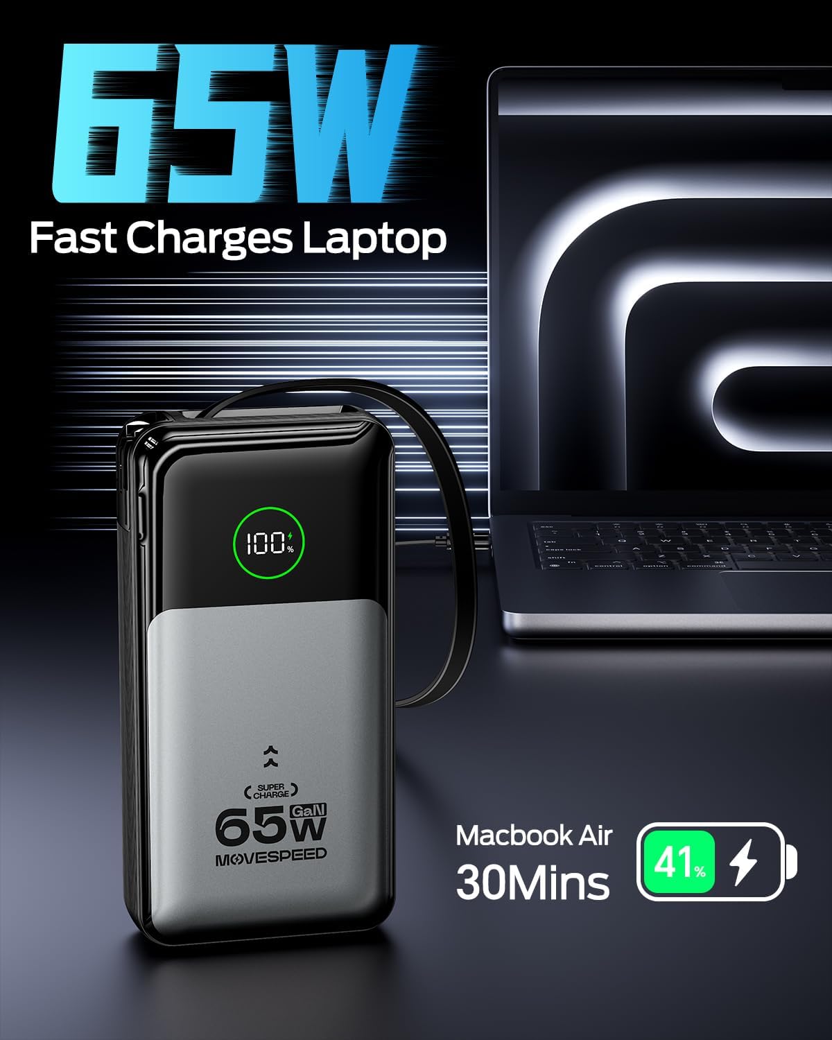 MOVE SPEED Portable Charger Laptop Power Bank 20000mAh 65W, Travel Essentials Battery Pack with Built-in Retractable USB-C Cable & Wall Plug, for MacBook/iPhone 17/16/15/iPad/Galaxy/Dell/HP and More