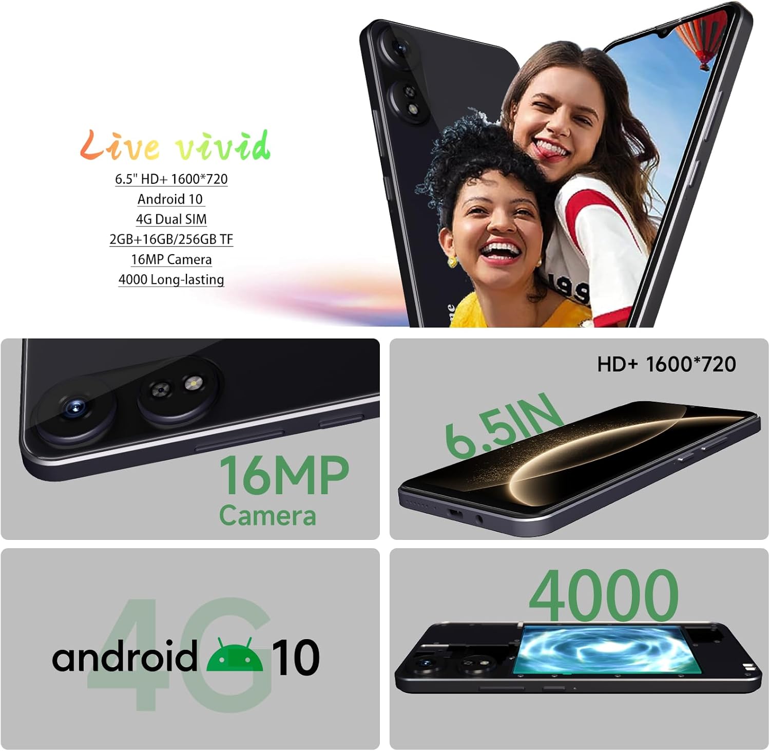 Android 10 Phones With Eye Care: The addition of eye care in android 10 system can more effectively protect your eyes in dim light environments, especially for the elderly and children. 16MP Main Smart Phone Camera: This unlocked smartphone is equipped with a rear 16MP main camera and a 5MP front camera, making it a great expert at recording beautiful moments in life. Please remove the lens protective film before use