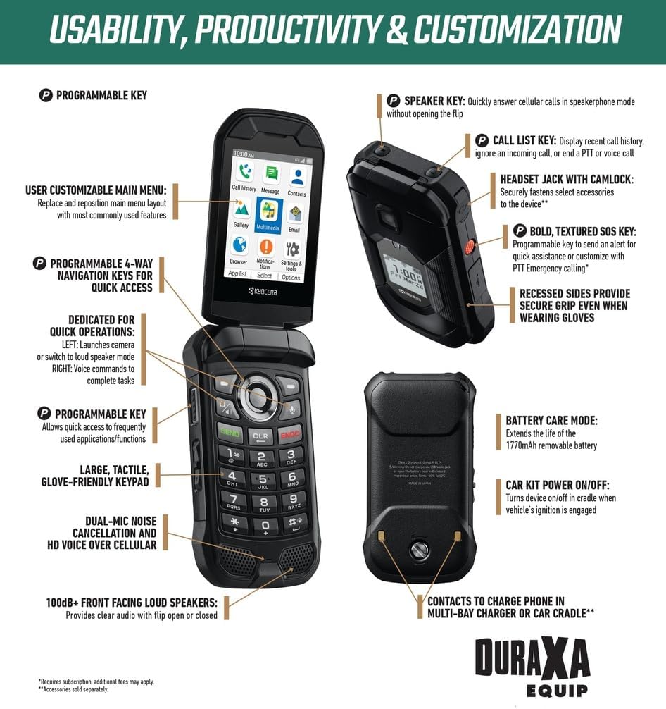 Compact & Customizable! DuraXA Equip’s customizable main menu allows you to set frequently used applications for quick access, and the ability to enlarge fonts ensuring readability. Multiple programmable keys allow you to customize the phone for your specific needs.