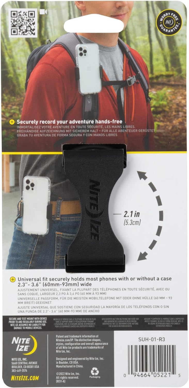 Universal Phone Holder Design: This Nite Ize phone holder fits most phones with cases, ranging from 2.3″ to 3.6″ wide, ensuring compatibility with a variety of devices