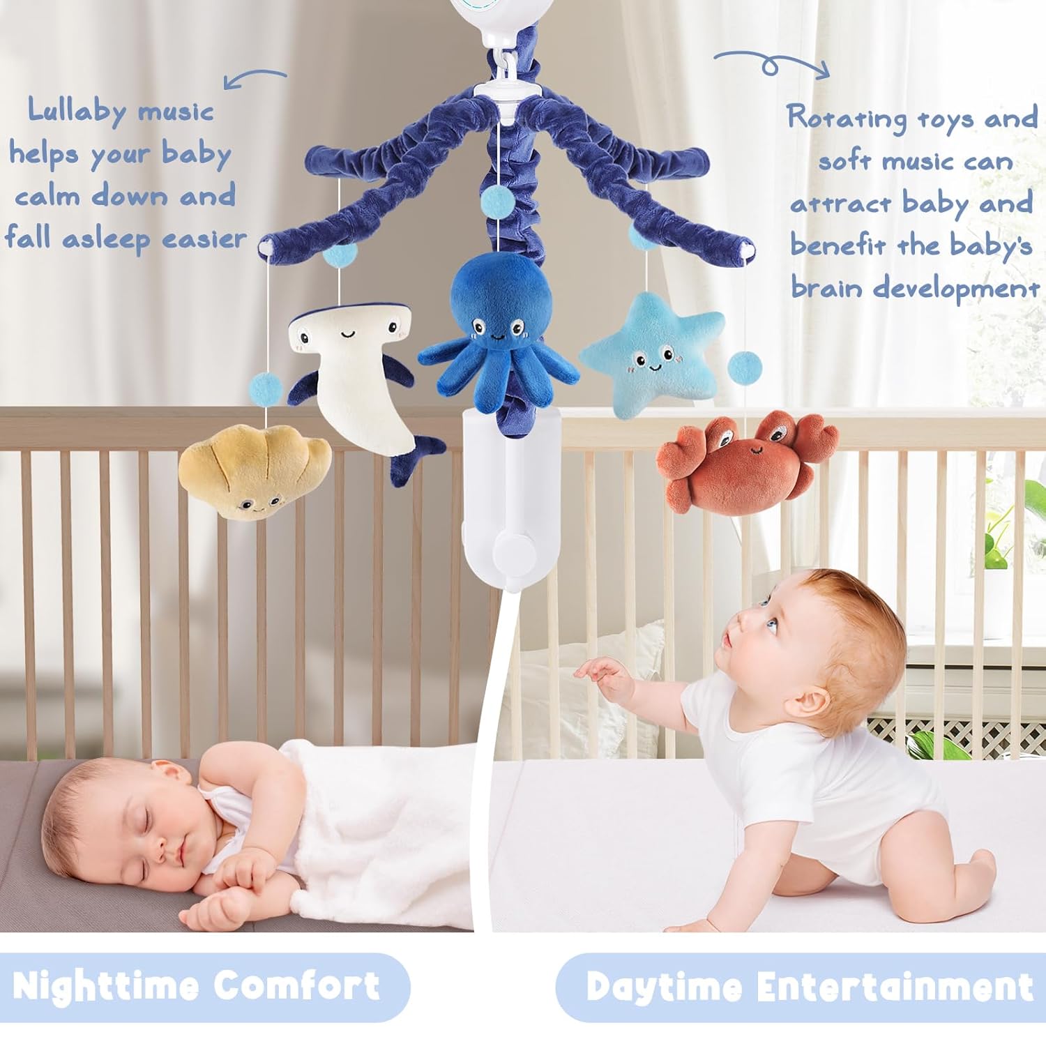 Charming Design: Dive into a world of wonder with this ocean-themed crib mobile, featuring a cuddly octopus, hammerhead shark, crab, seashell, and starfish. Gently swaying above, these soft sea friends bring comfort, curiosity, and a sense of calm—creating a peaceful underwater escape where your baby can dream and grow