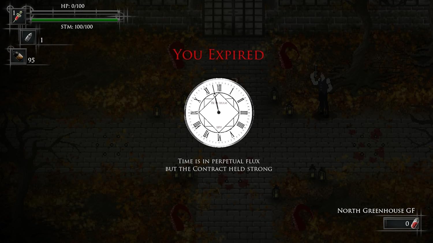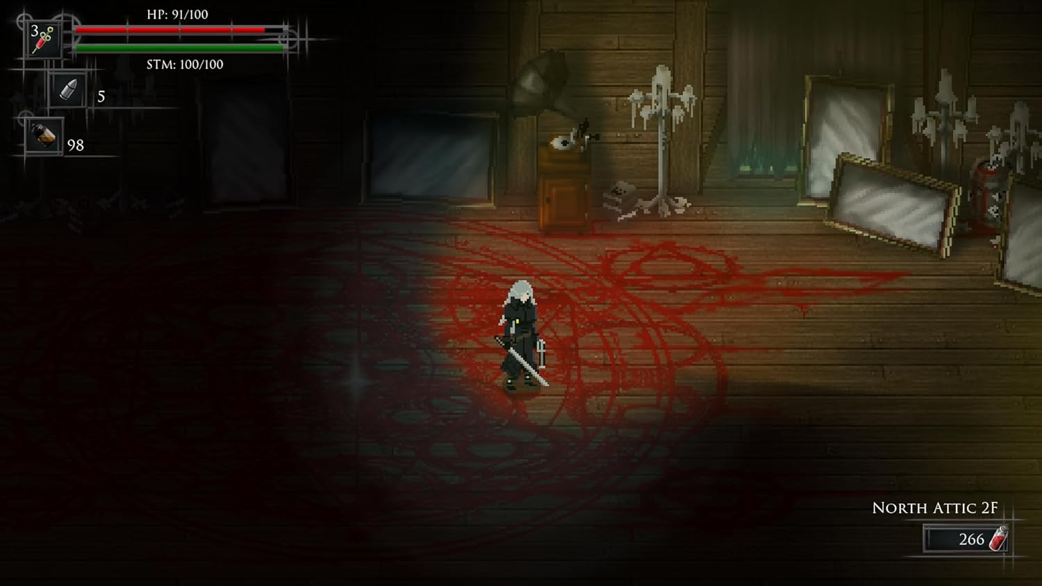 A strange and repelling madness took hold of the servants roaming the halls, and they will attack on sight, for their madness is one rooted in a deeper understanding of cosmic insignificance. To repel the maddening horrors, your Iaito cane, and Waltham A9 hand canon will aid you. To mend your injuries your Vitae concoctions will offer healing.
